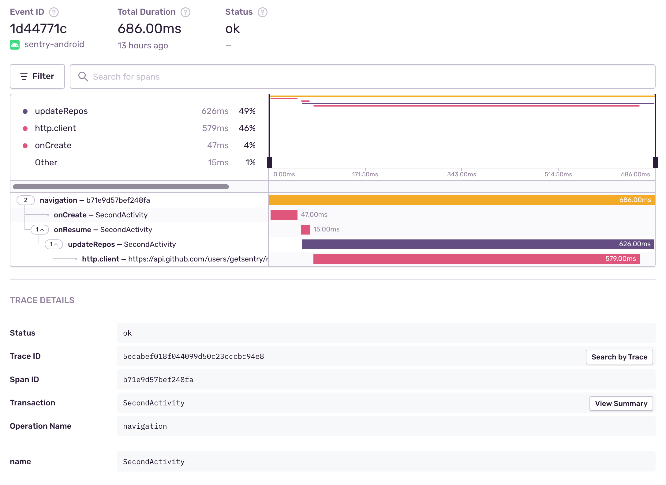 </application>The current version of our Android SDK supports auto instrumentation activity rendering, which can be expanded on through custom instrumentation. Additionally, in the coming weeks, you’ll be able to automatically create spans for active transactions as well as record breadcrumbs for outgoing HTTP requests.