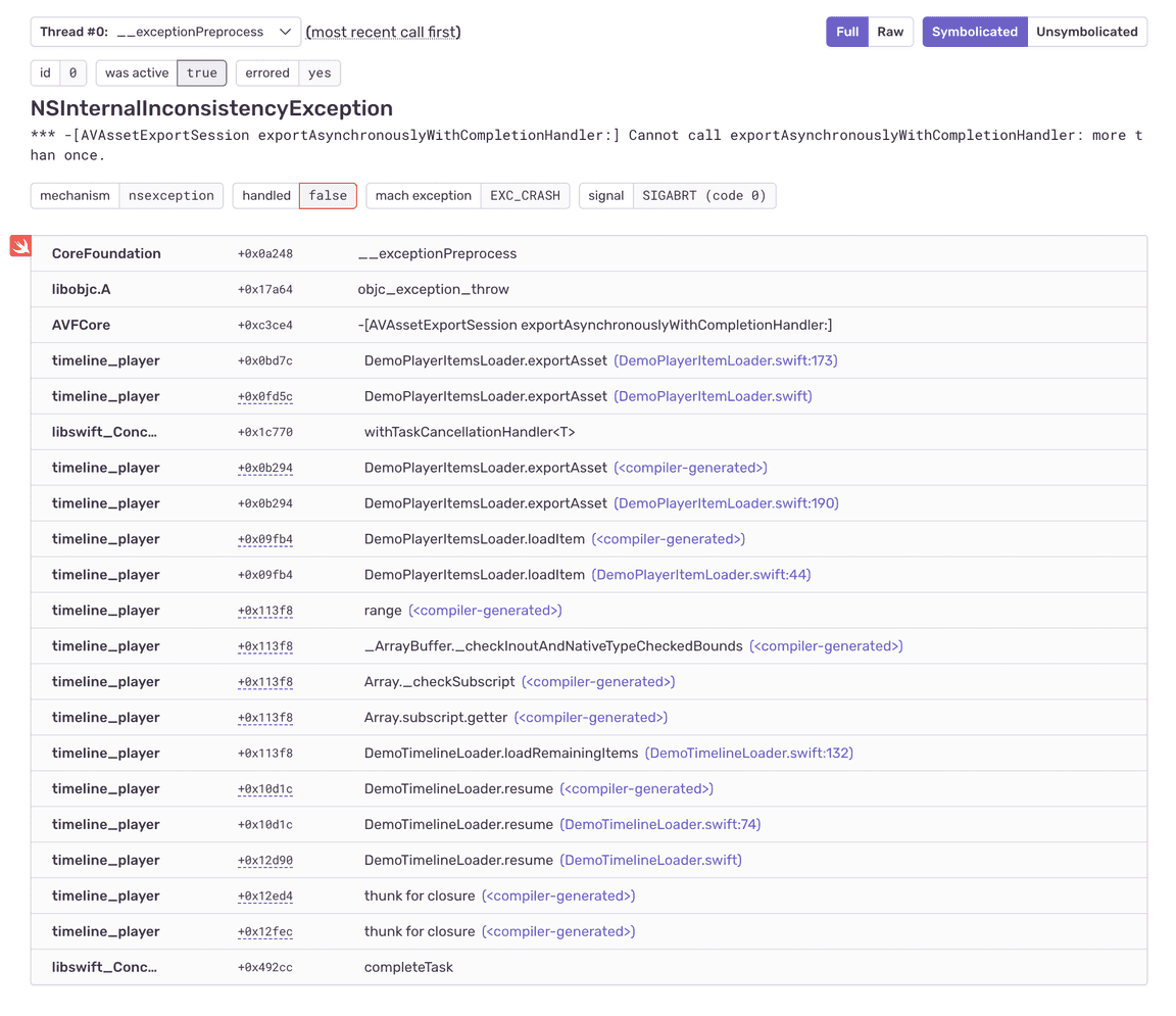 But once they’ve uploaded their debug symbols to Sentry, they end up with a symbolicated stack trace: