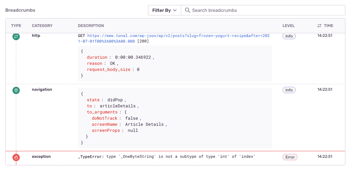 Another way they maintain a smooth UX is by configuring breadcrumbs so developers investigating issues not only see a timeline of a user’s actions that led to an error, but all the context needed to reproduce and resolve it... fast: