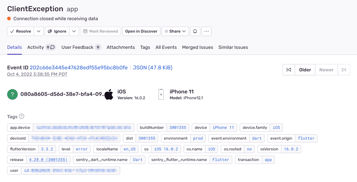 For example, a QA engineer looking at edge cases during new feature testing might pick up on a UI issue. Sentry shows them real-time data on the issue like the HTTP requests a user made leading up to it, and any navigation they did, with detailed context including the team responsible, Flutter version, and build number, making it easier to file an actionable bug report that’ll include enough detail on how to reproduce and ultimately resolve the issue:
