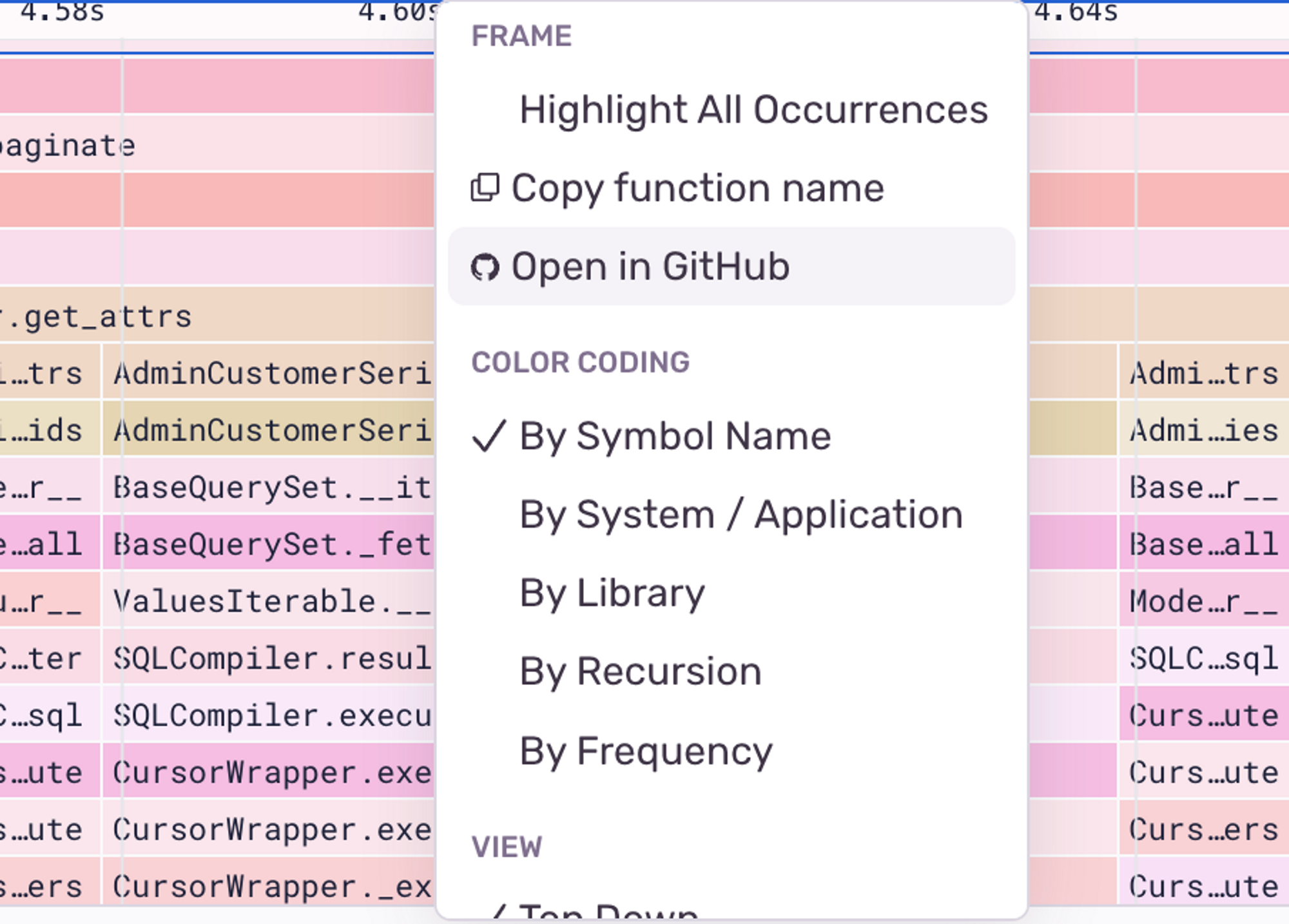 From here, it’s easy to identify functions like AdminCustomerSerializer.get_member_counts and AdminCustomerSerializer.get_current_billing_histories, which are the places in the code that the SQL queries are being executed from (as you can see by reading further down the function call stack to CursorWrapper.execute). From here, you can click on a frame and Open in GitHub to navigate directly to the code: