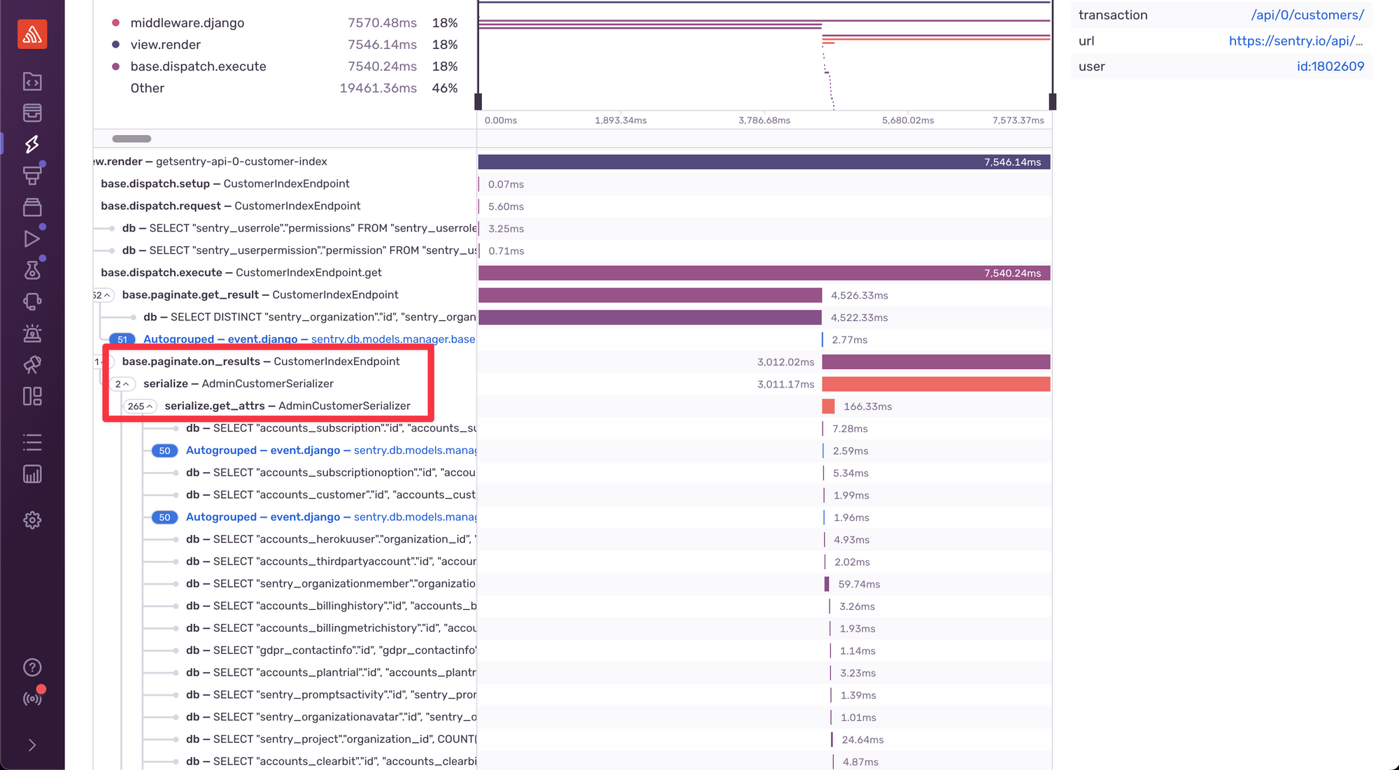 The transaction data shows that when paginating CustomerIndexEndpoint, a significant amount of time is spent in AdminCustomerSerializer. We can see the raw database queries contributing to this time below that, but it’s difficult to understand where in the code these queries are being executed.