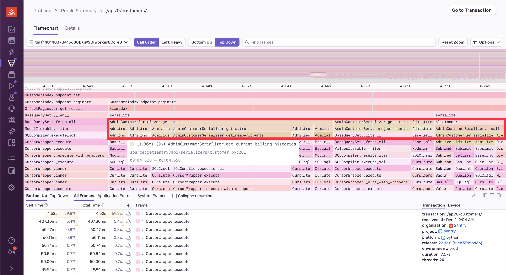 Let’s walk through a short example of using tracing and profiling to explore a CPU-intensive workload using an example from one of Sentry’s APIs (yes, we use Sentry to monitor Sentry). Here’s a transaction from our /customers endpoint: