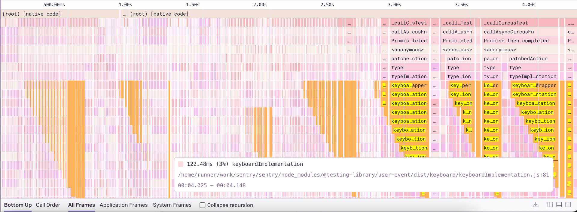 In the above flame graph, we can see a waterfall pattern of calls to keyboardImplementation which occurs roughly 7 times in our entire test run and takes a big chunk of the total test time.