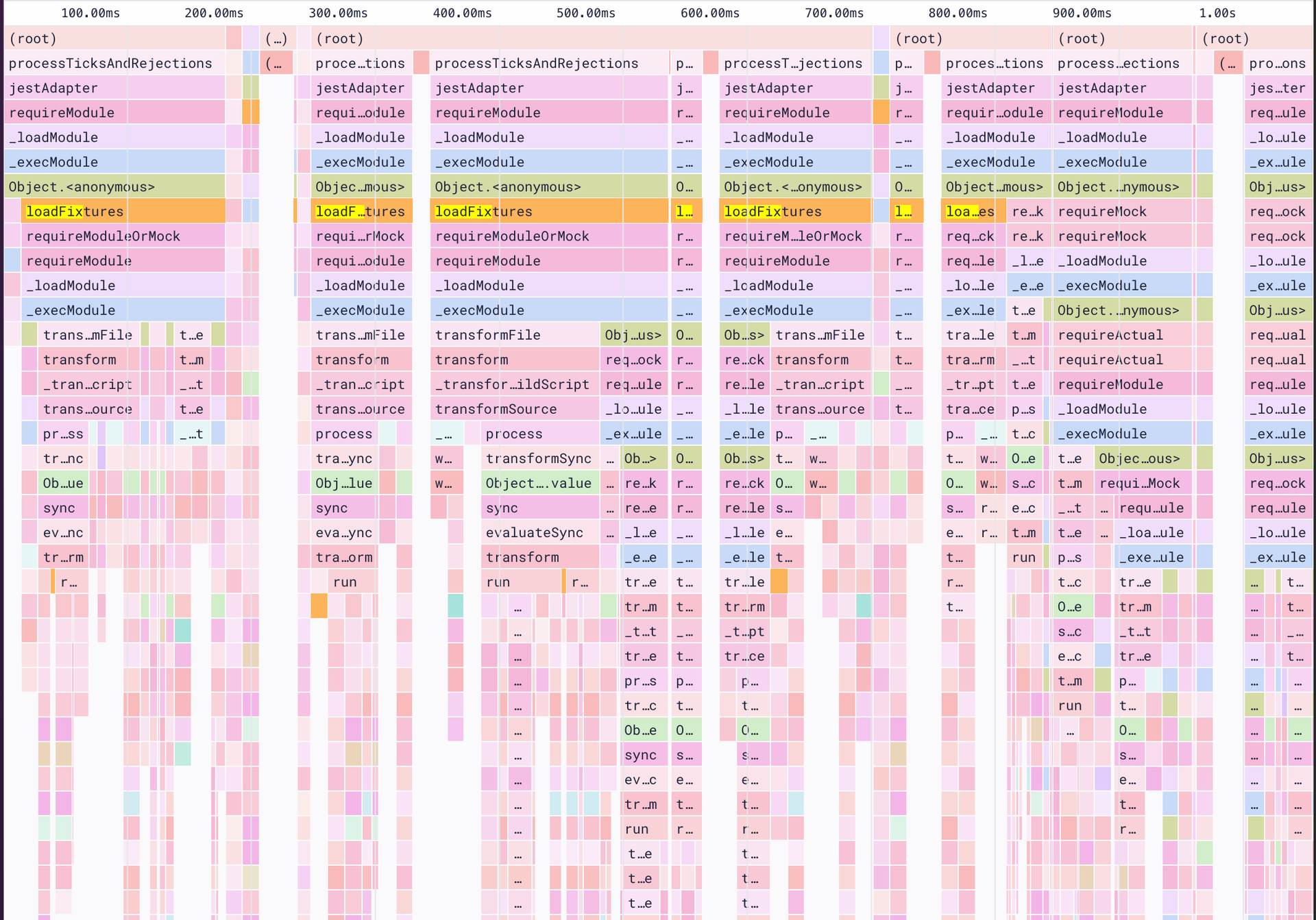 }There is nothing wrong with this code; it allows us to stub parts of the code in our tests without having to write require/import statements. However the ergonomic benefit of this developer experience does not come for free. It means that we are now preloading all of the code inside our stubsDir (even if it is not actually required by the test). This problem is further exacerbated by the fact that Jest does not respect require.cache and the fact that scripts defined in setupFilesAfterEnv run once per file.