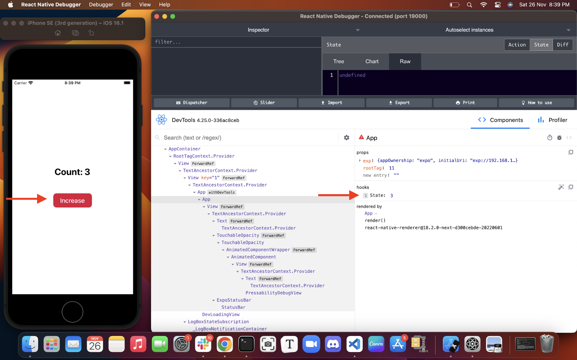 Under the Components tab, you can also debug the current state and prop of any component. Here, I've updated the code for a simple increment counter app: