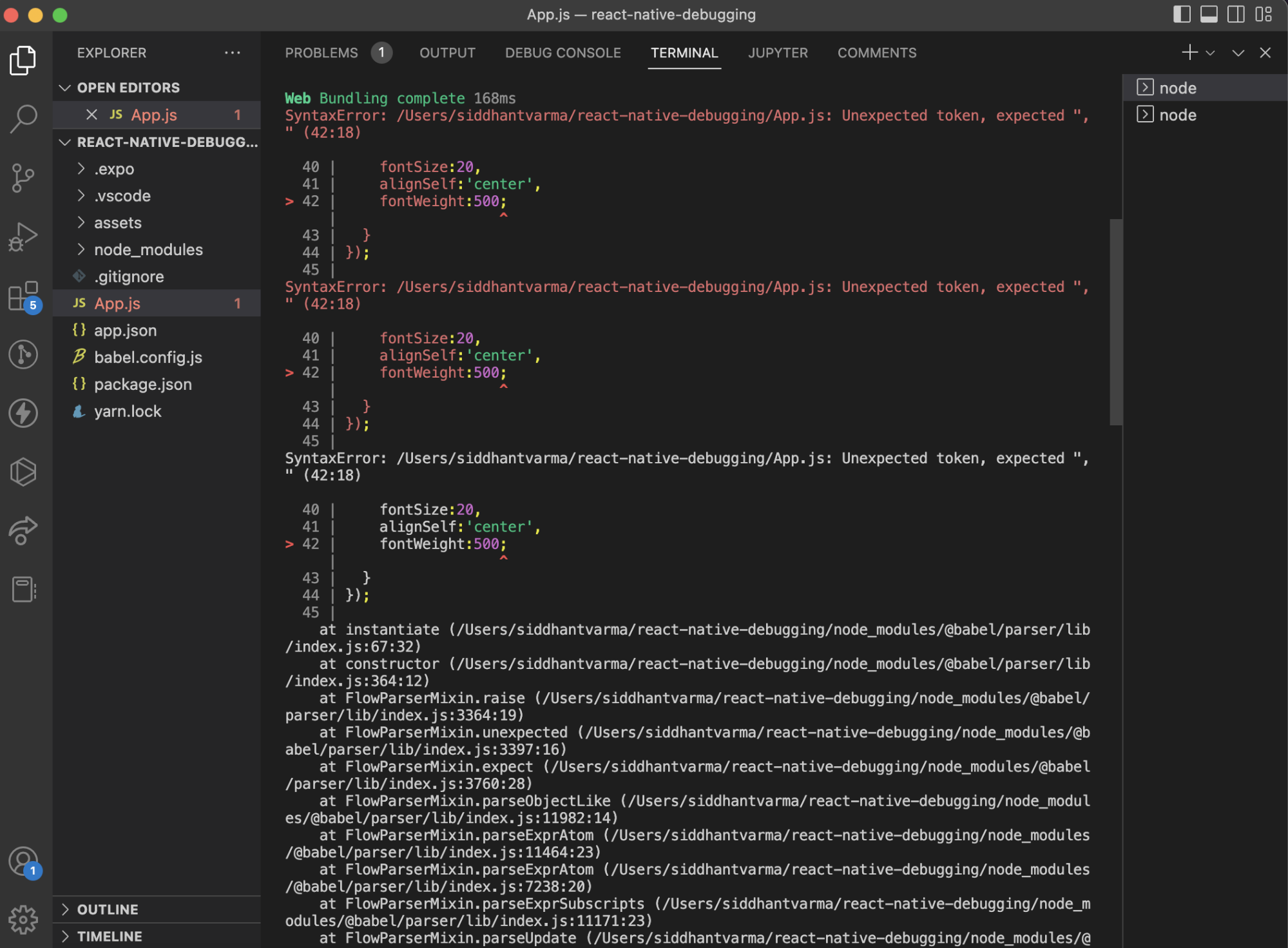 It specifies the type of error, the file, and the line at which the error was thrown along with an error message. The Expo terminal is the first place where all logs will appear. So, whenever you're debugging your app, that terminal can be the first place to look.