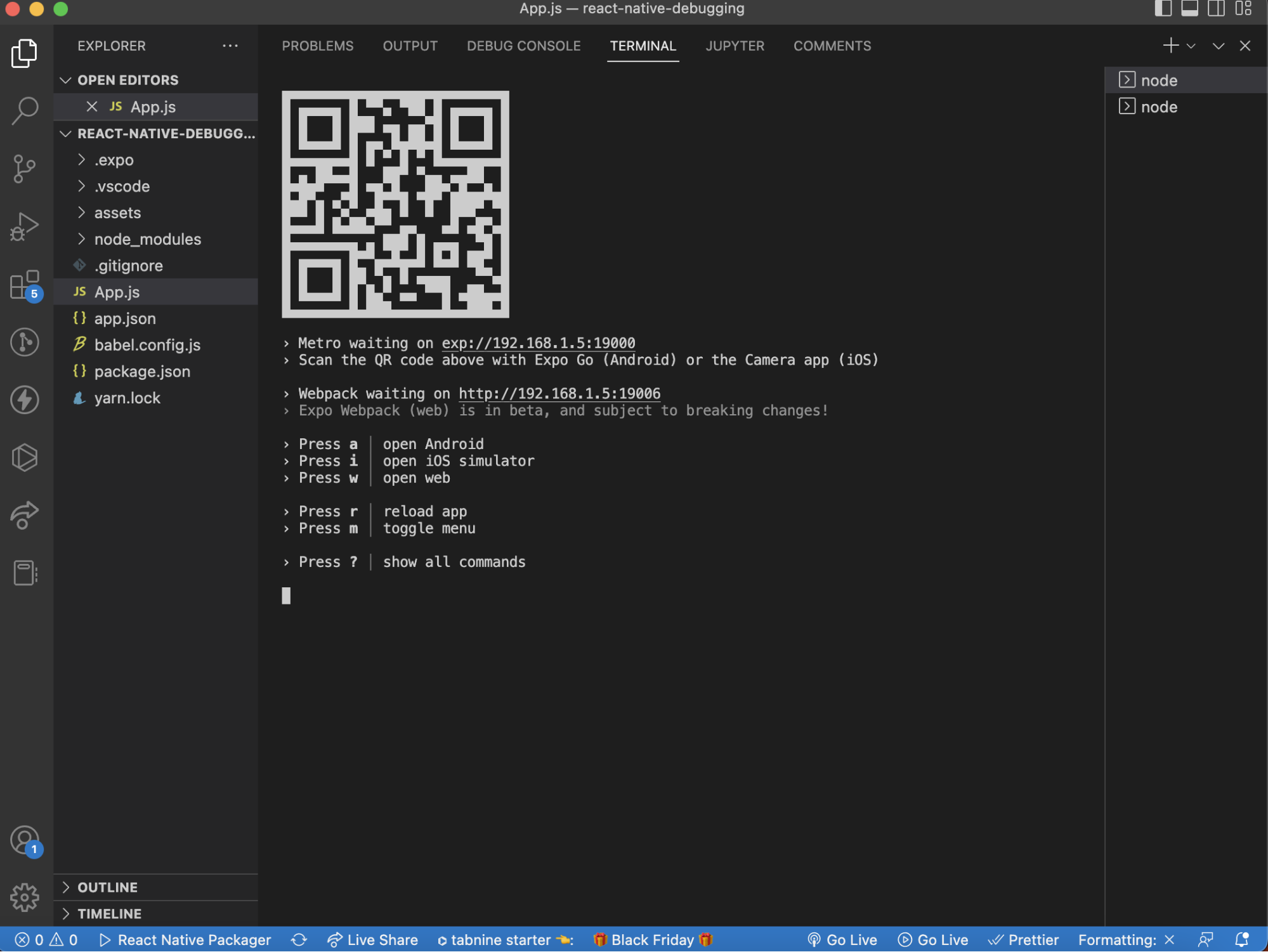 First, let's understand the common techniques you can use for debugging in a React Native app. I've created a new Expo-based React Native project that I'll use throughout this tutorial. You can do the same using the following command: