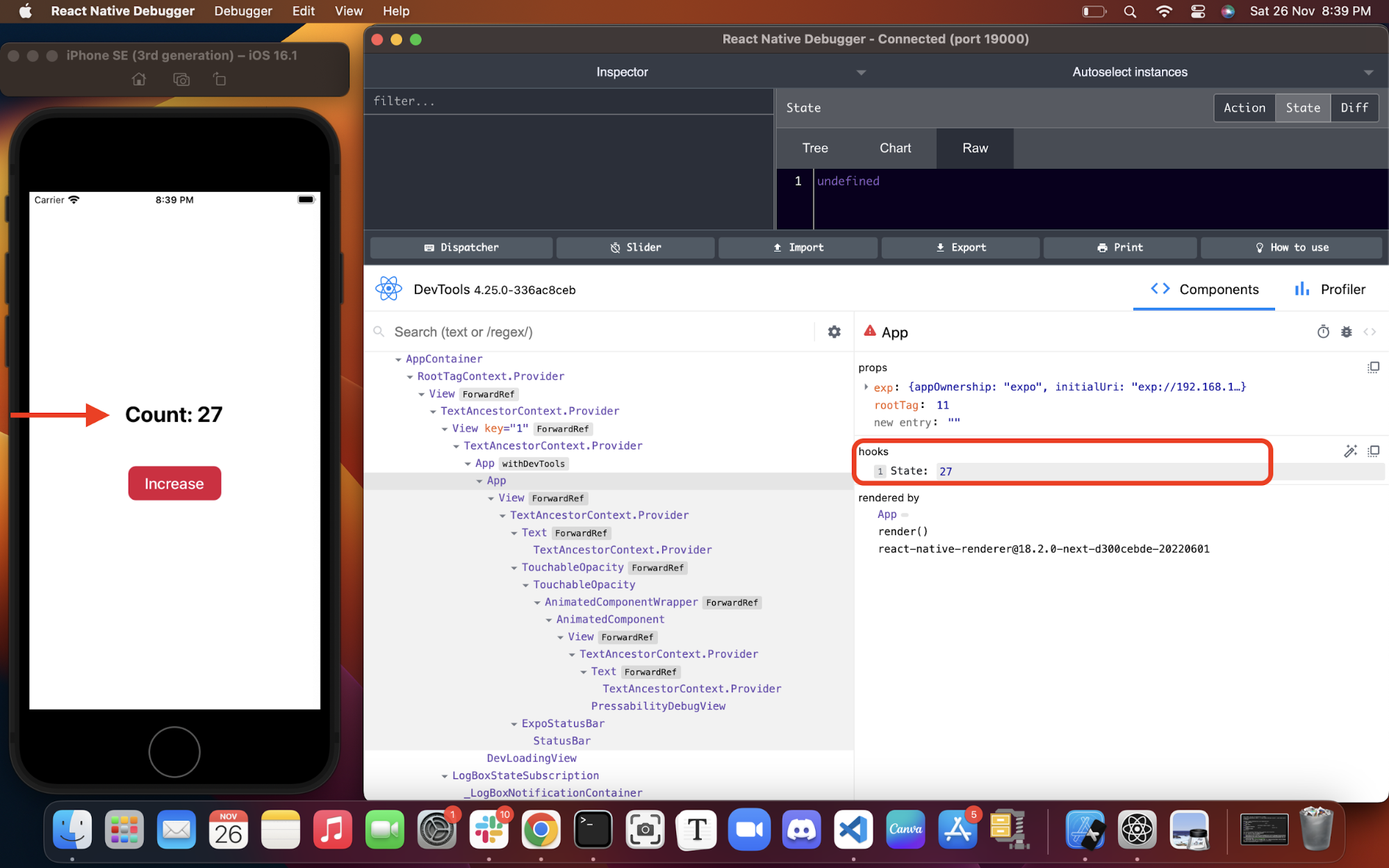 Here you can see all your components, inspect them, look at their styles, and debug the UI of your React Native app as if it were a web app. Not only this, you can also view the component's state and props, any children elements rendered, etc. When you're debugging more complex things in your React Native app like interactions between various components in a hierarchy tree, this can be extremely helpful.