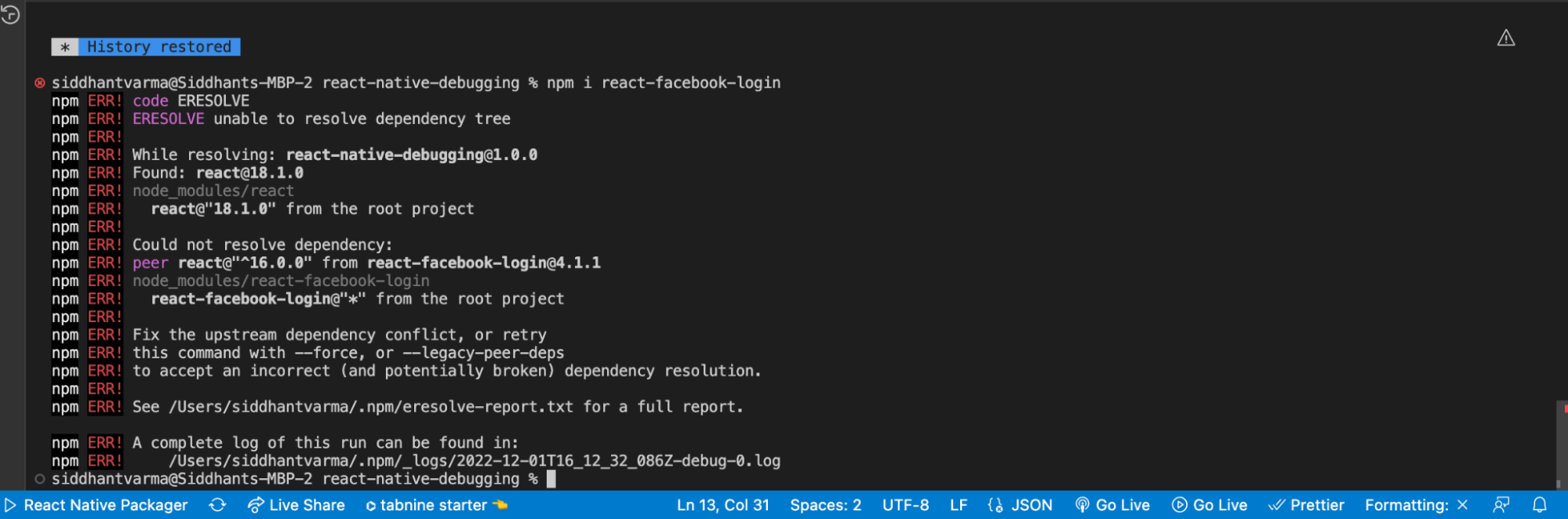 The whole React ecosystem heavily relies on third-party plugins or dependencies. However, that also creates room for faulty plugin errors. The most typical ones include installing a plugin that's not supported on the current version of Expo/React Native or, in some cases, a web plugin that doesn't support the native ecosystem. For instance, here's an example of a faulty plugin error when you install react-facebook-login plugin on Expo: