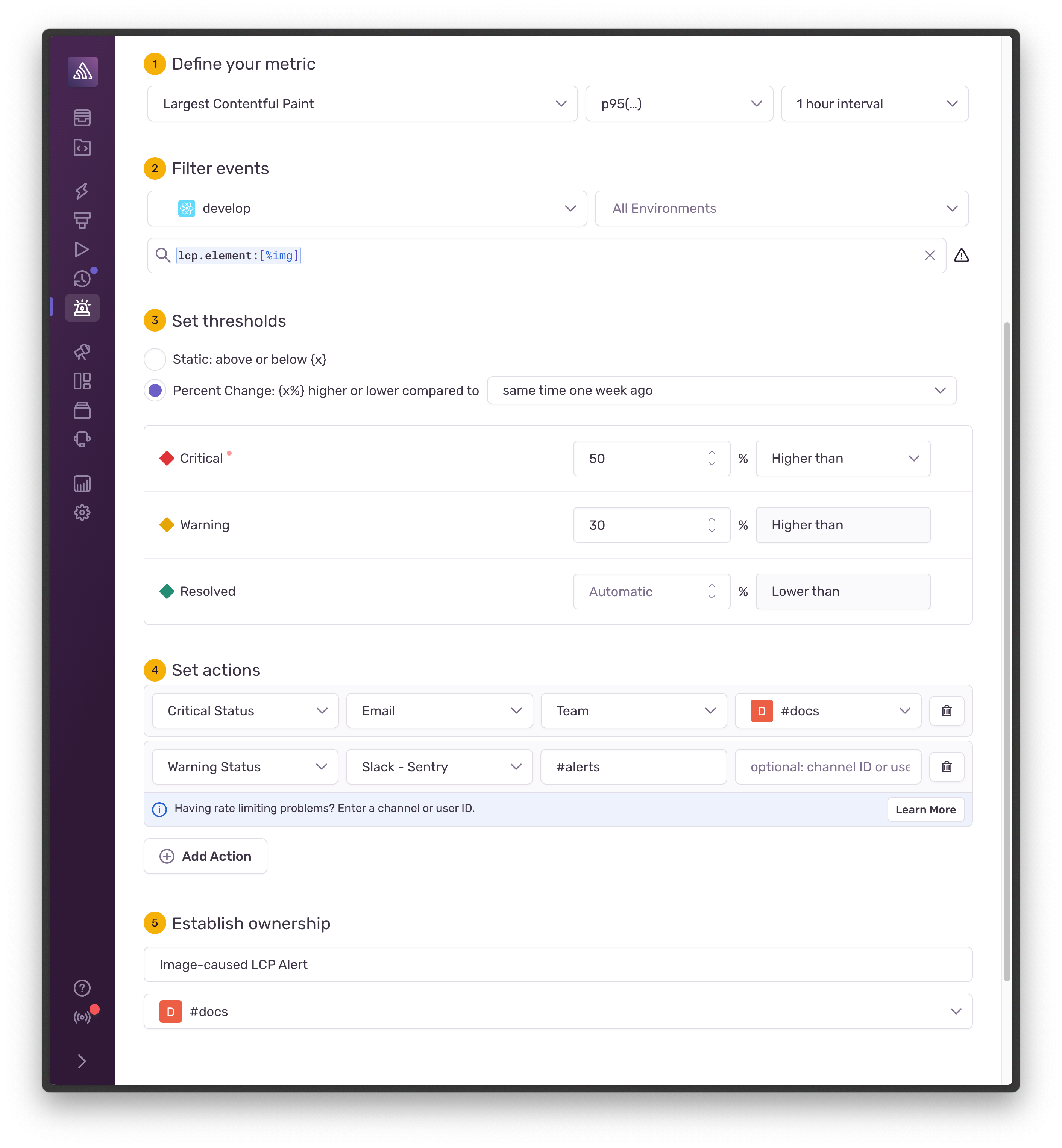 lcp.element:[%img]to only trigger the alert for images that are causing LCP issues.Referring to the historical LCP values charted at the top of the page, choose the Critical, Warning, and Resolved thresholds. For example, you m ight set the Critical threshold to a 50% change, the Warning threshold to a 30% change and leave the Resolved threshold automatic.