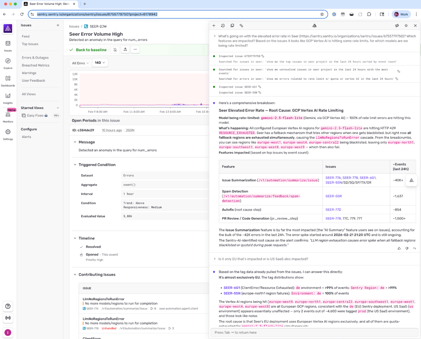The initial detection came from a standard Sentry alert. But figuring out what was actually broken, which user-facing features were impacted, which regions, which model, and whether this was EU-only or global, came from Seer running an analysis on that LlmNoRegionsToRunError issue.