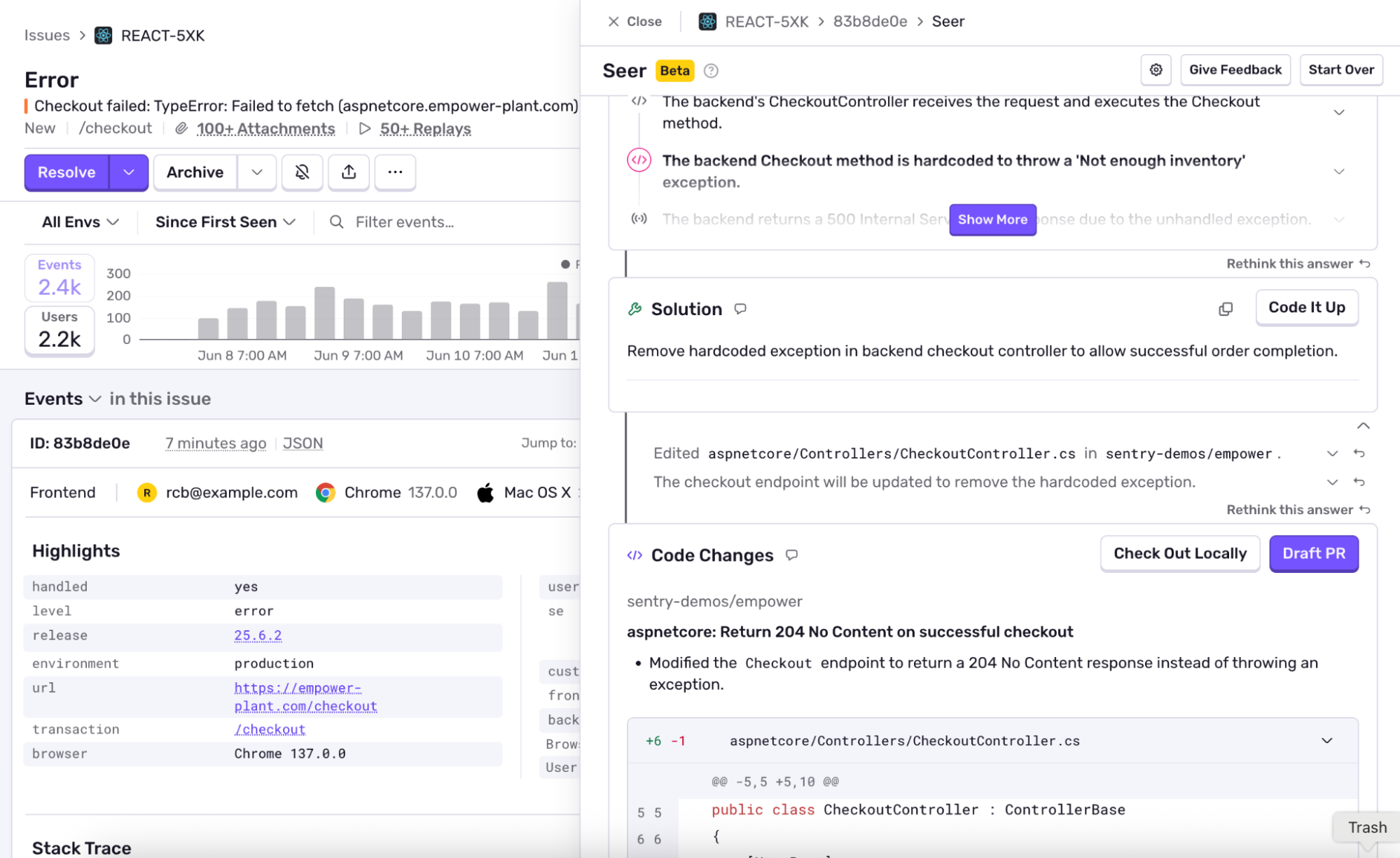 In one of our sample apps, Sentry logged a TypeError on the React frontend: "Failed to fetch". Seer traced it through the stack to an ASP.NET backend, where a recent change had broken the API response. The frontend wasn’t handling the null value—because no one told it to.