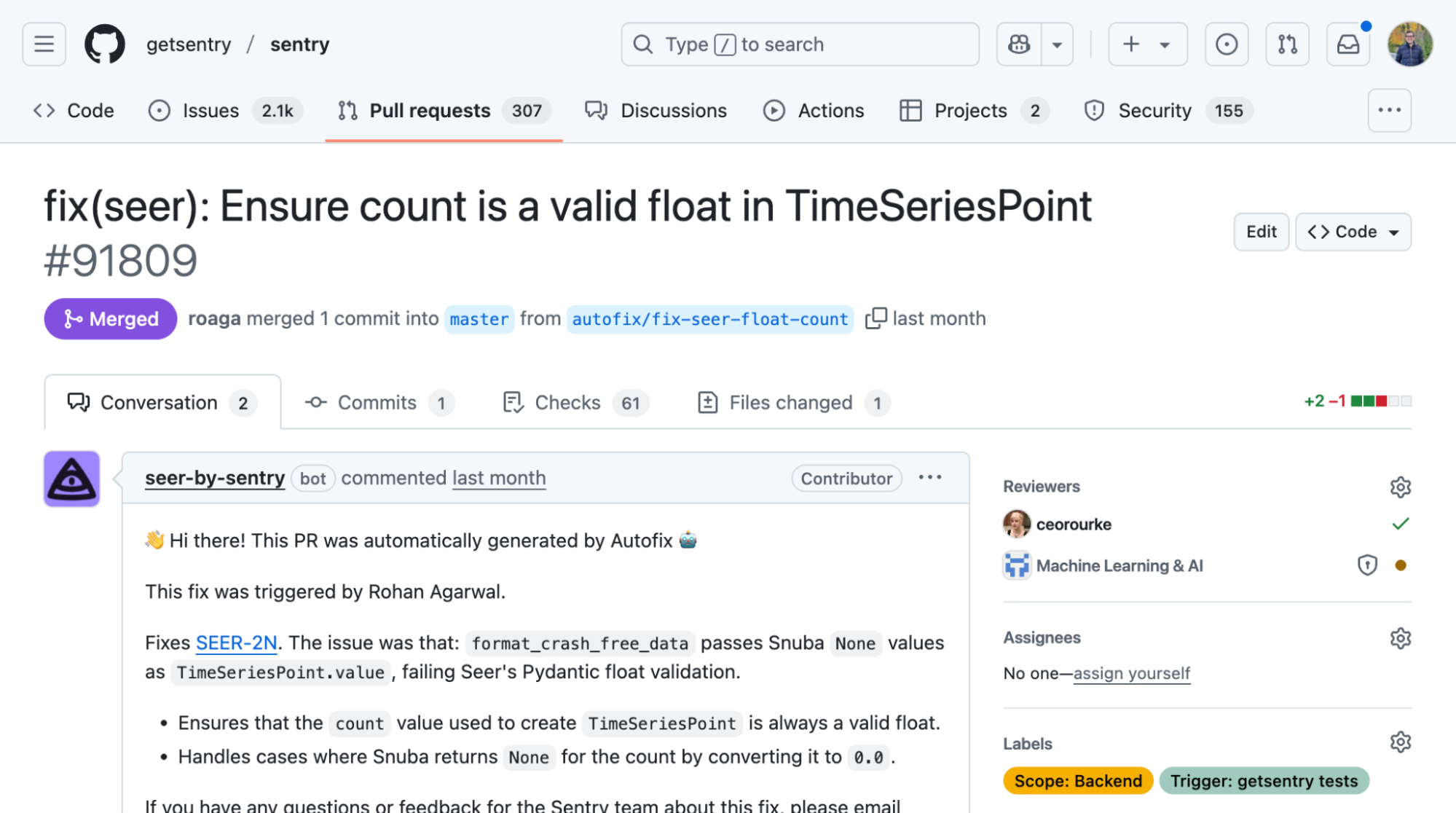 We’ve seen it ourselves too. In one case, Seer opened a PR in the Sentry repo (yes, it’s fixing itself) to resolve an exception caused by unhandled None values. All our team had to do was review the diff and hit merge.