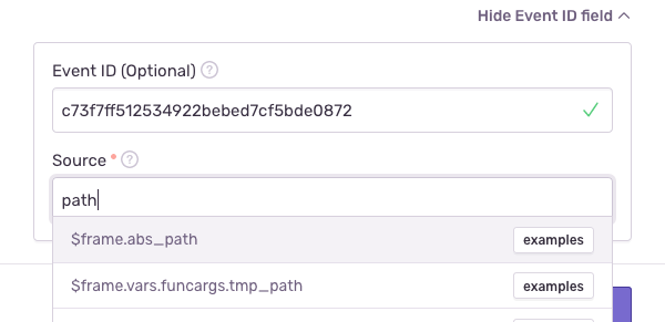 $frame.abs_pathinto "Source" to look into frame file paths for sensitive data and nothing else. Other choices like$stringand**generally work as well but are often too broad to be useful. For example, a file path in other parts of the event may contain usernames that don't refer to the user device whatsoever. Context matters, and "Source*"* provides that context to Sentry.You can use the "Event ID" field for further assistance when filling out this form. This is merely a convenience feature that helps Sentry understand your objective and provide better autocompletion for "Source". The "Event ID" refers to the value shown when viewing an error: