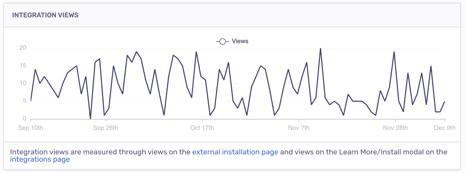 Next, we have a chart showing the number of views on your integration. When a user browses the integrations page (found in Settings > Integrations), any clicks on the installation modal count towards this metric. You can use this information to determine conversion rate or gauge the general interest that people are showing in your integration, for example.
