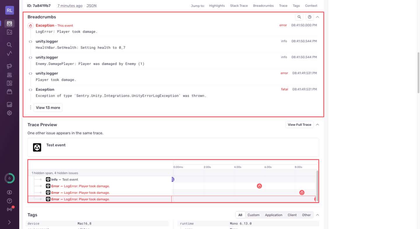 When these kinds of errors occur in production, Sentry generates crash reports that show exactly where in your code a dynamically removed GameObject is being accessed. This helps you identify and fix issues where a GameObject is destroyed too early.