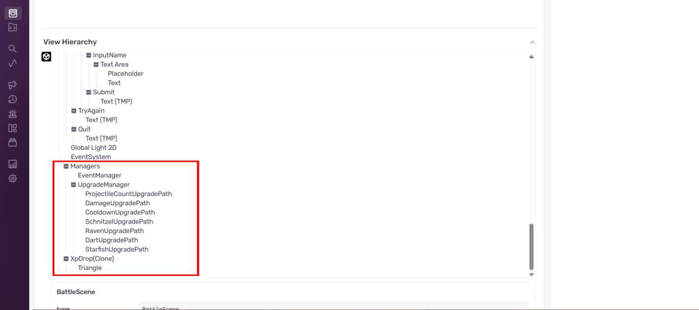 You can now remove the SoundManager GameObject. Select it in the Scene Hierarchy panel. Find it in BattleScene under the Managers object. The next time the game tries to play a sound, a MissingReferenceException will be thrown and Sentry will capture the error.