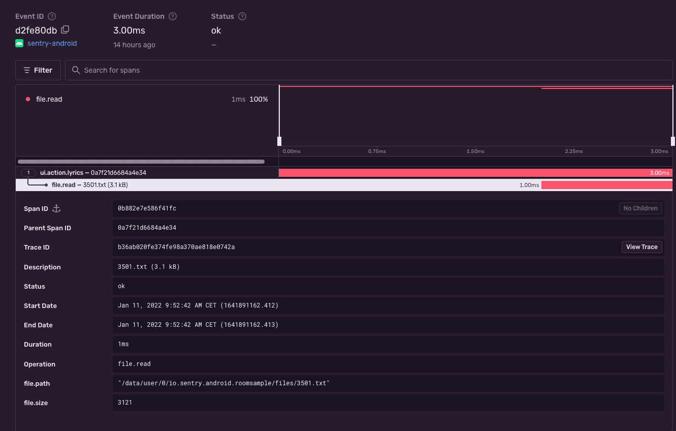 When we record File I/O spans, we capture some useful metadata; information like file absolute path, raw file size and the filename. This can help tremendously in identifying which File I/O operations slow down the application.