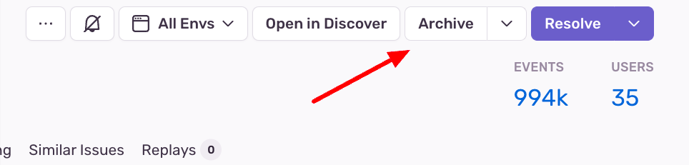 Is your Issue Stream cluttered with non-urgent issues because you don’t want to Ignore an issue in case it starts trending? Good news. You can Archive an issue to remove it from the main Issue stream until it becomes worse (i.e. starts escalating). If the frequency and potential impact of an Archived issue increases, Sentry will automatically resurface it in the main Issue stream and tag it as Escalating. Unlike Ignoring issues, by Archiving you can clean up your issue stream and plan for Sentry to notify you if it regresses.