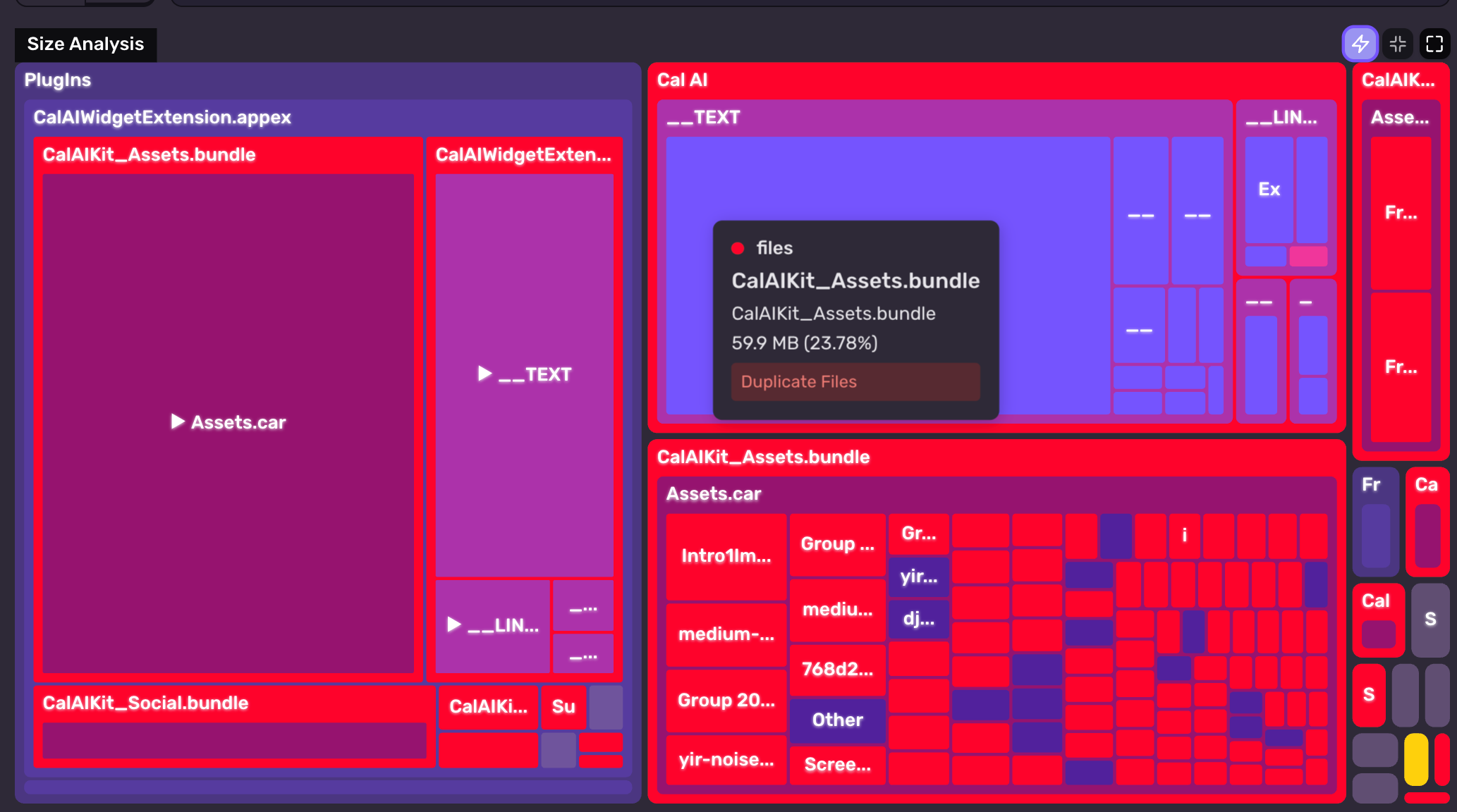 Here we have the CalAI app (analyzed from a public App Store build). CalAI has an install size of ~250 MB. Looking at the Size Analysis, we can see very quickly that a large chunk of the app size (30%) is from duplicating an asset.car file twice.