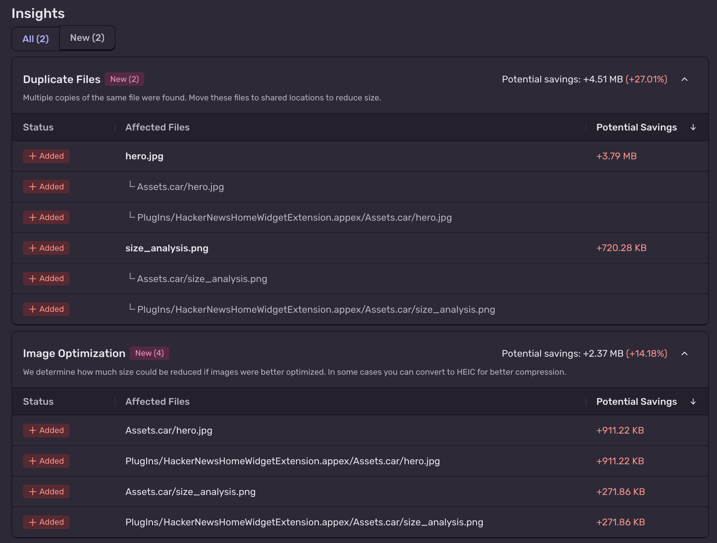 We again see the overall size difference, but this time we also see two Insights. Not only were the images we added not optimized, they’re also being duplicated. Clicking in, we can see the exact files that can be optimized + how much space that would save.