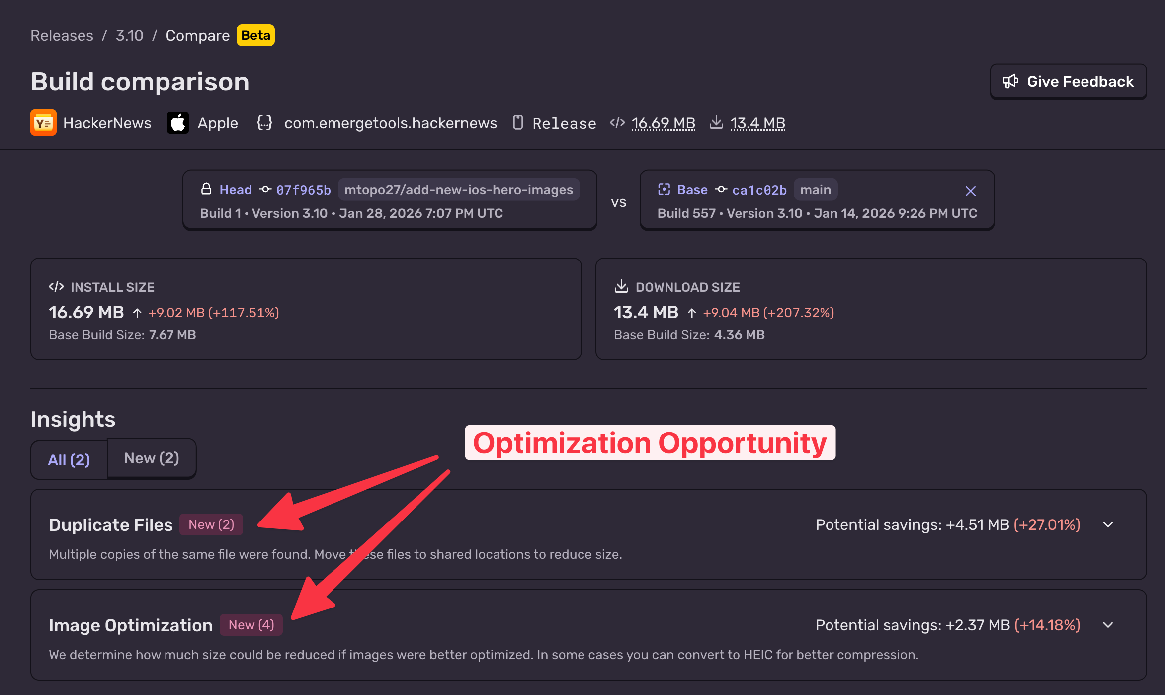 Size Analysis integrates into your CI workflow so you constantly have a pulse on your app size. Every build can be uploaded and diffed. Any time size changes, you won’t just see that it changed, you’ll see why it changed, and if there are any recommended fixes you can do to make it smaller.