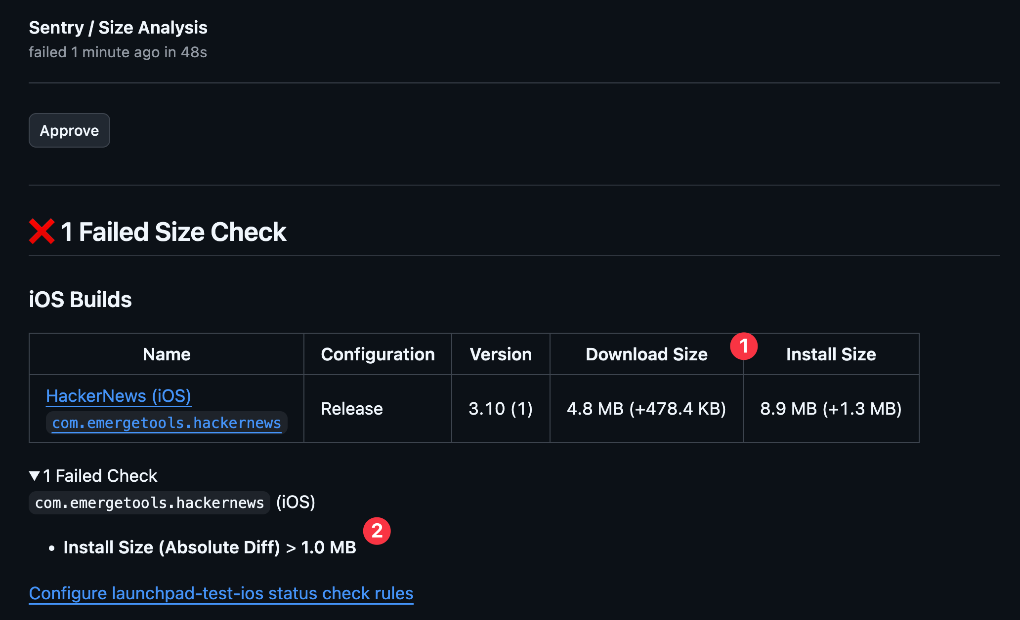 We can double check our “Comparison Page” to confirm the diff is as expected and then approve the PR. From this page we are able to see the overall size change as well as both a tabular and visual view of every file that changed size.