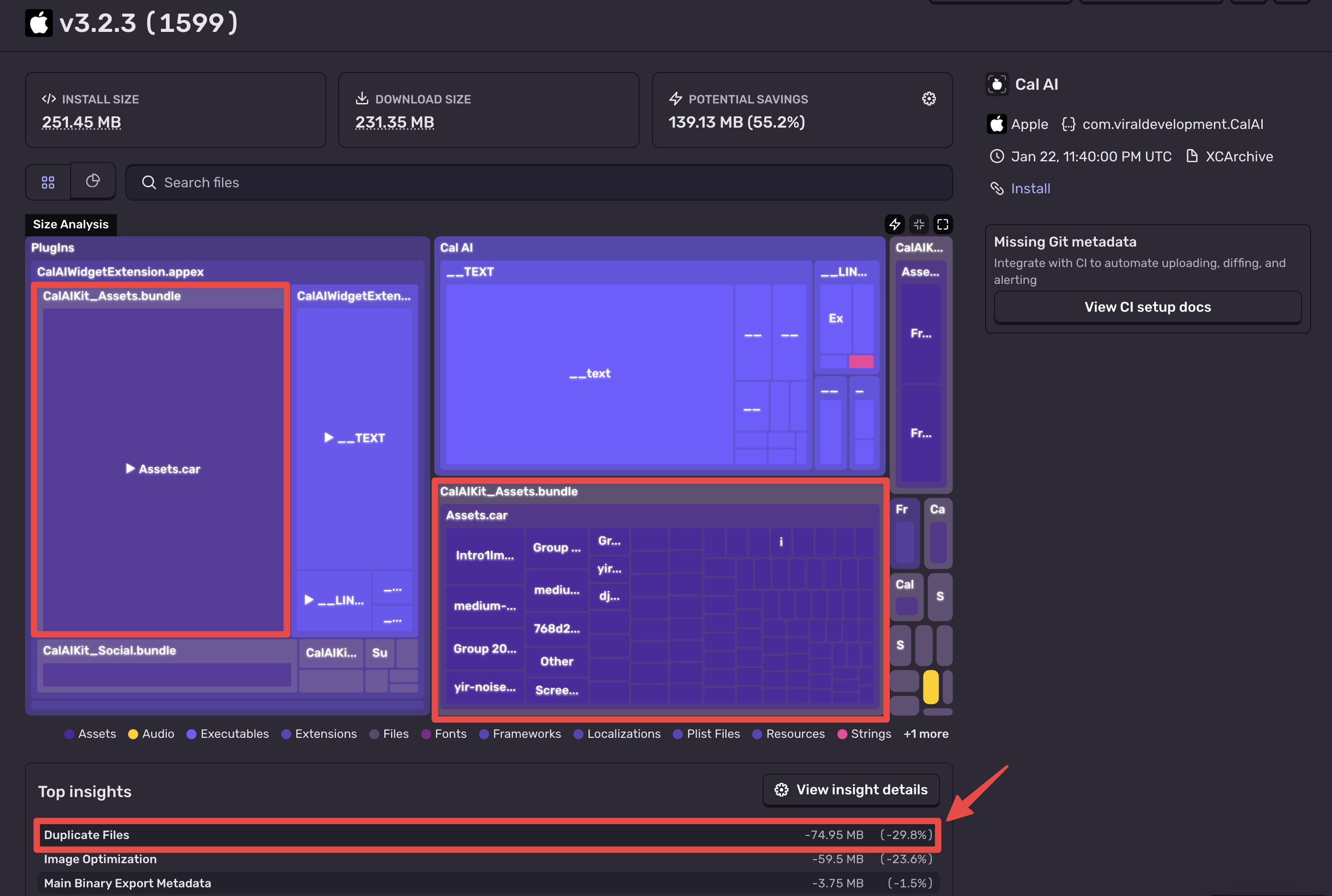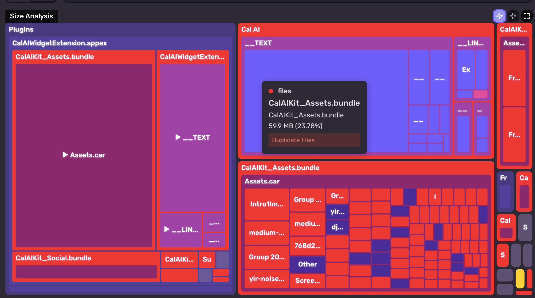 Here we have the CalAI app (analyzed from a public App Store build). CalAI has an install size of ~250 MB. Looking at the Size Analysis, we can see very quickly that a large chunk of the app size (30%) is from duplicating an asset.car file twice.