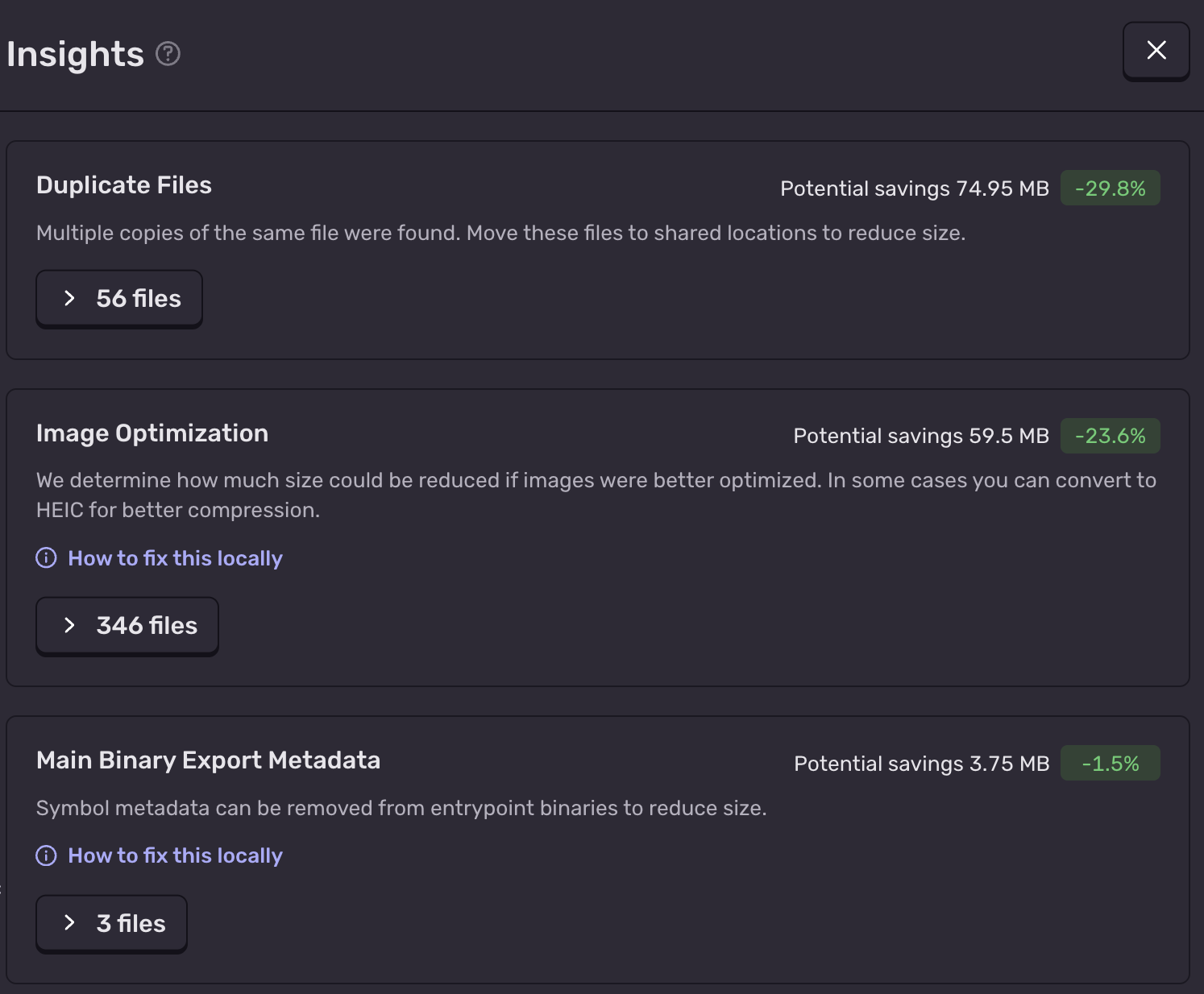 Automated monitoring is critical to make sure your app size doesn’t creep up, but in reality, your app might already need slimming down. For every build that you upload, Size Analysis will give you a detailed breakdown of where size is coming from + how you can reduce its size.