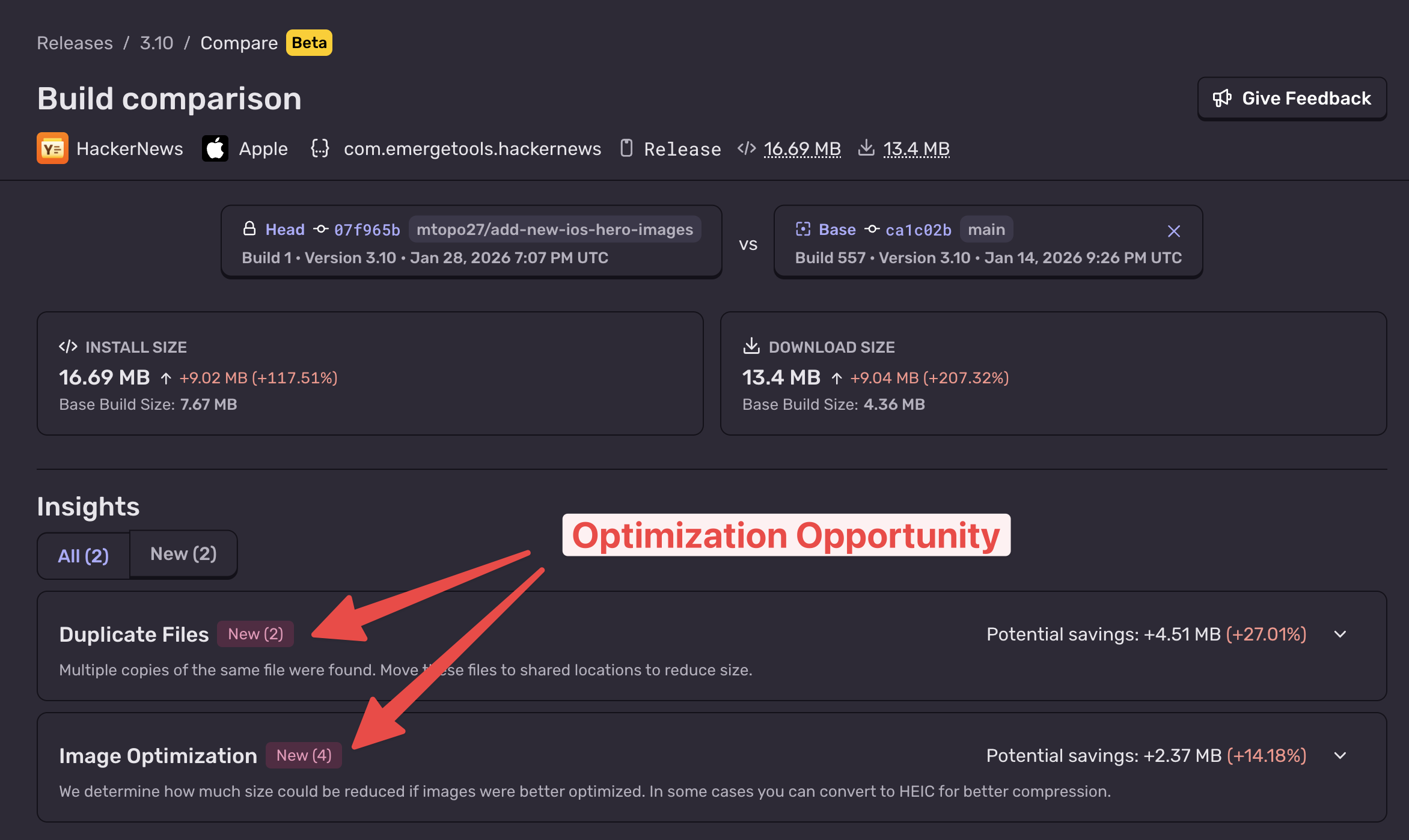 Size Analysis integrates into your CI workflow so you constantly have a pulse on your app size. Every build can be uploaded and diffed. Any time size changes, you won’t just see that it changed, you’ll see why it changed, and if there are any recommended fixes you can do to make it smaller.