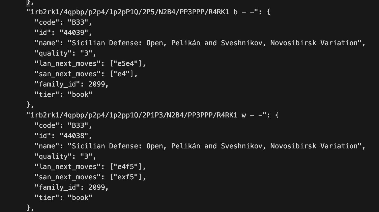 21 MB is a lot of JSON and something to be immediately suspicious of. Inspecting this file, we can see it’s actually a list of all the possible openings that Chess.com highlights (if you’ve ever played a game on Chess.com and seen the esoteric opening names, this is where it’s coming from).