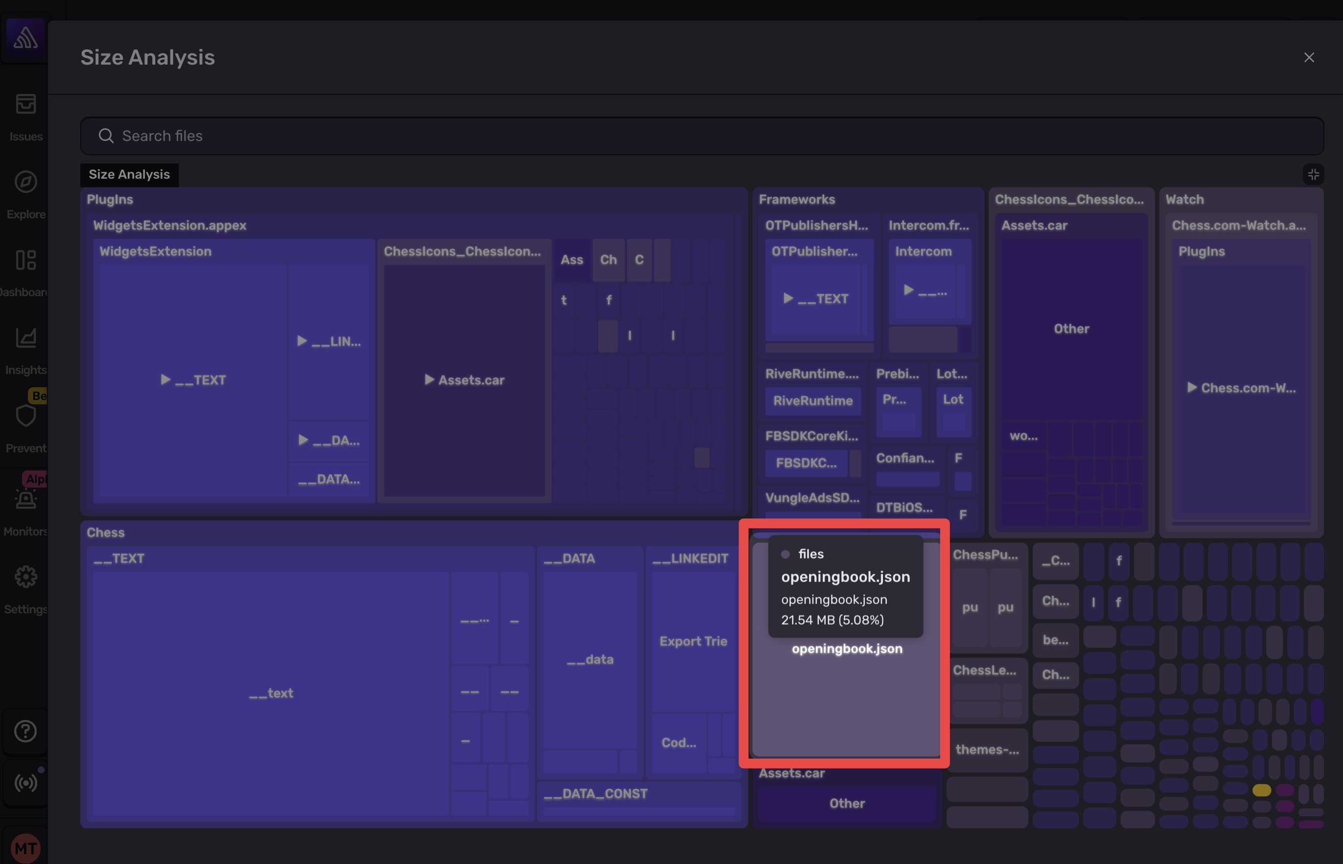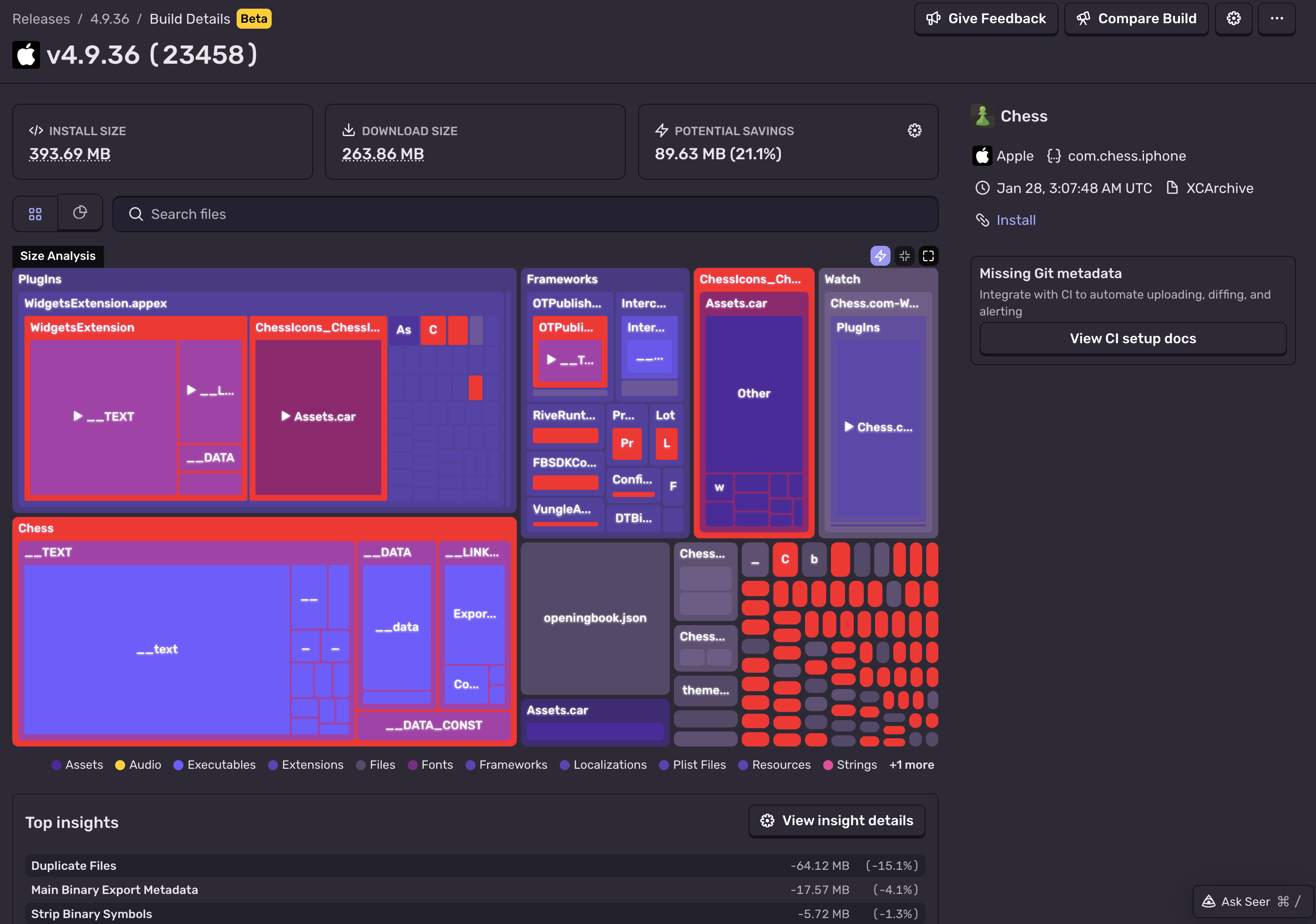 Looking at a build’s details is great for seeing easy size win opportunities, but it also helps you understand where size is coming from. Below is the Chess.com app (also analyzed from a public App Store build):