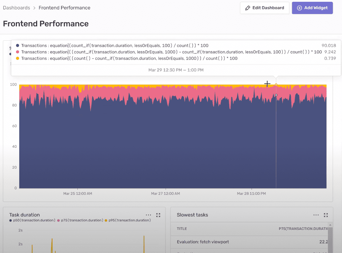 Besides single event investigations, Sentry is also very useful to get a general overview of how our app is performing from dev to QA to production and we use dashboards to make sure that we’re always up to date on how performance is looking across the frontend, the backend, and our evaluation service.