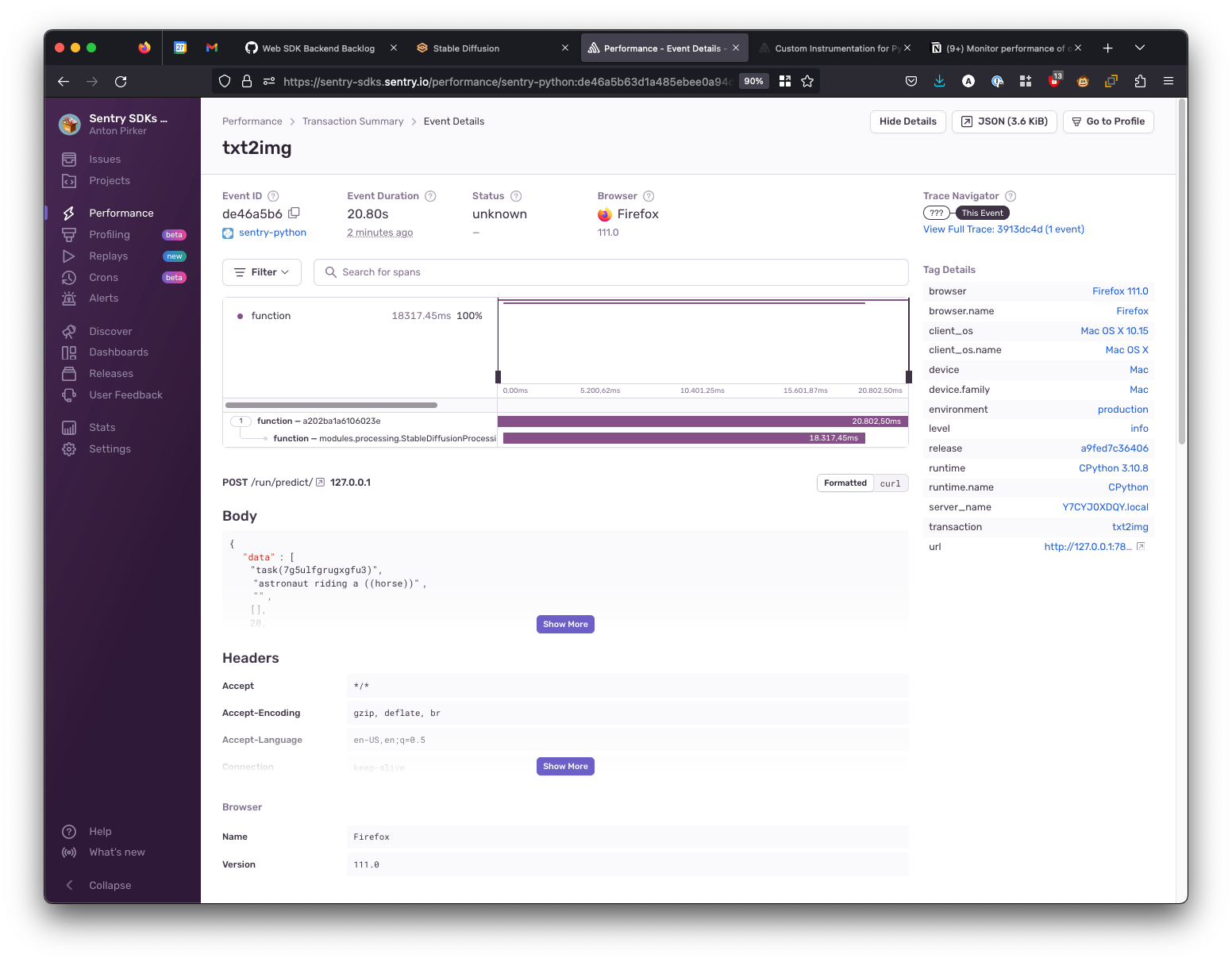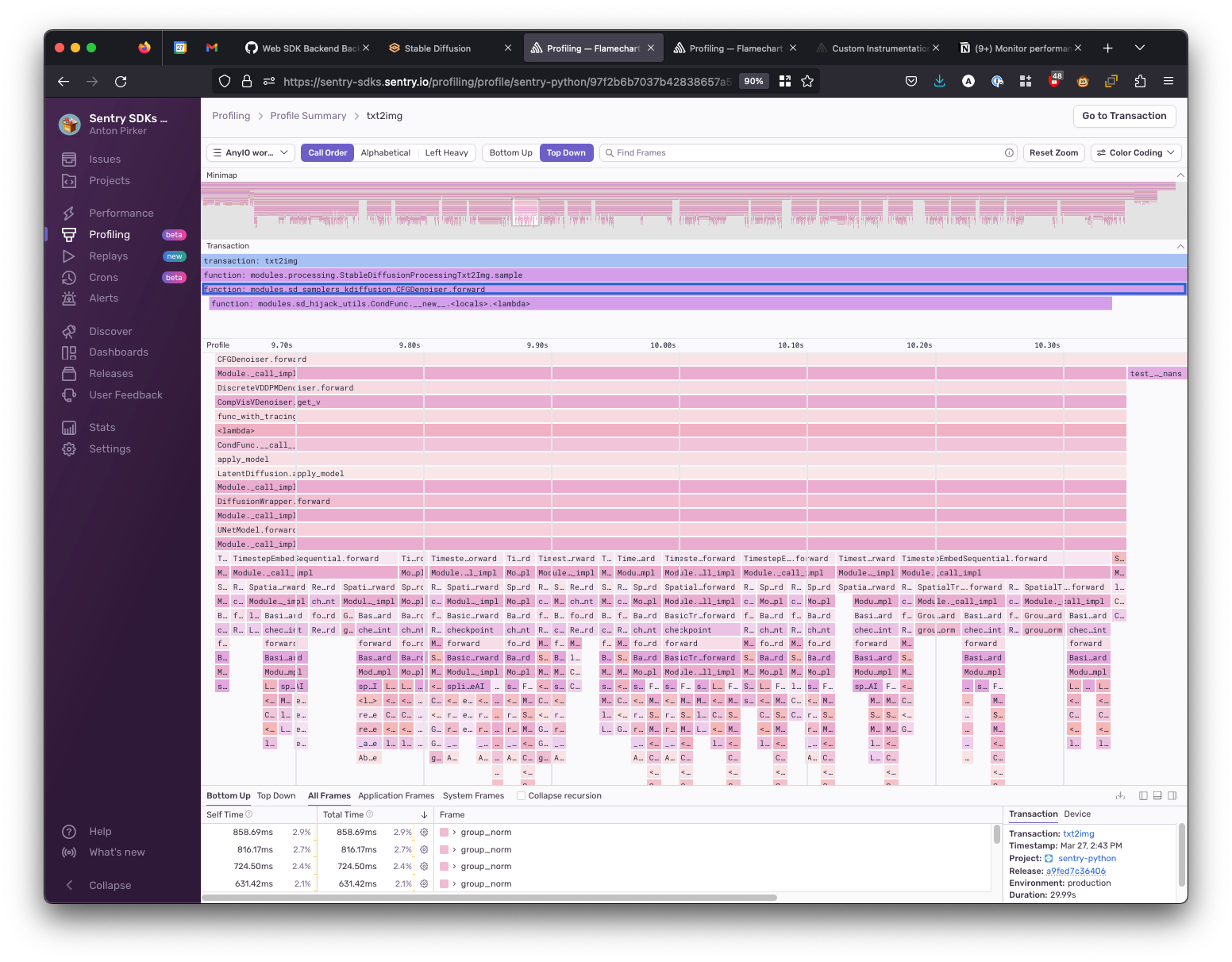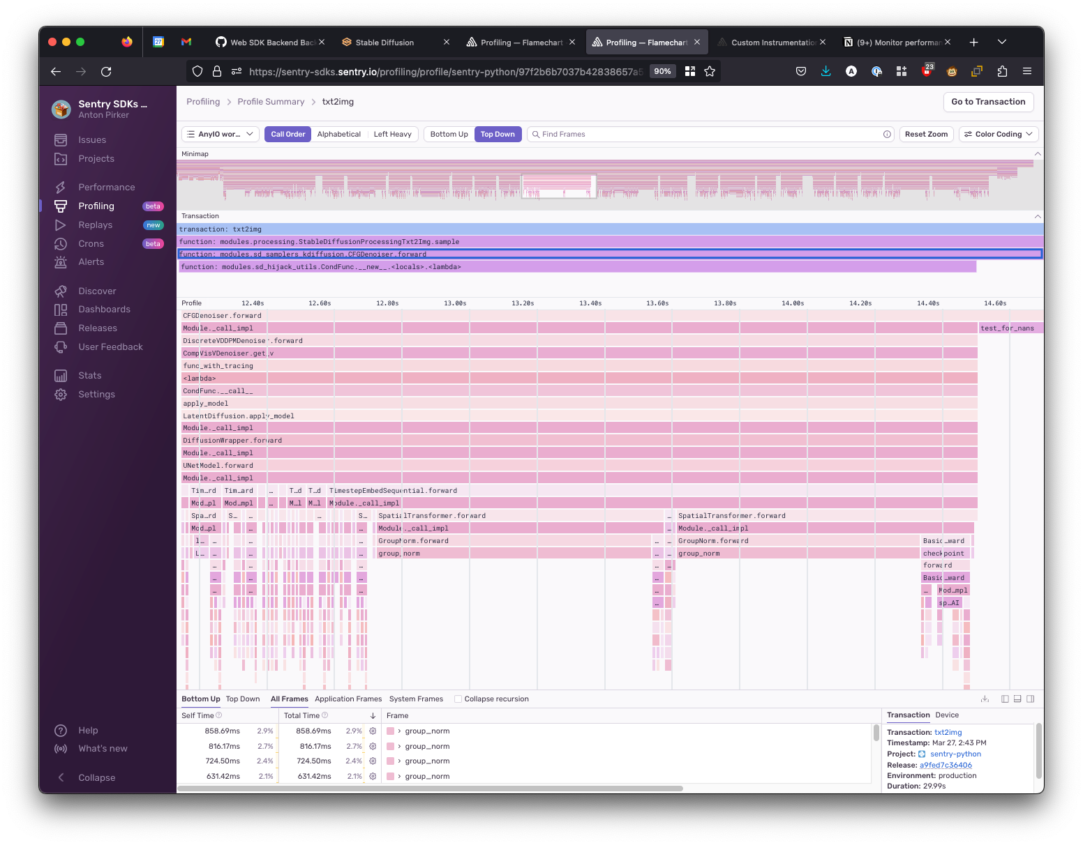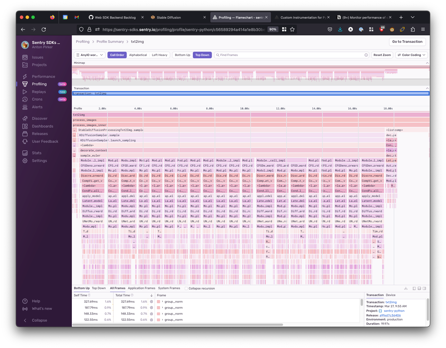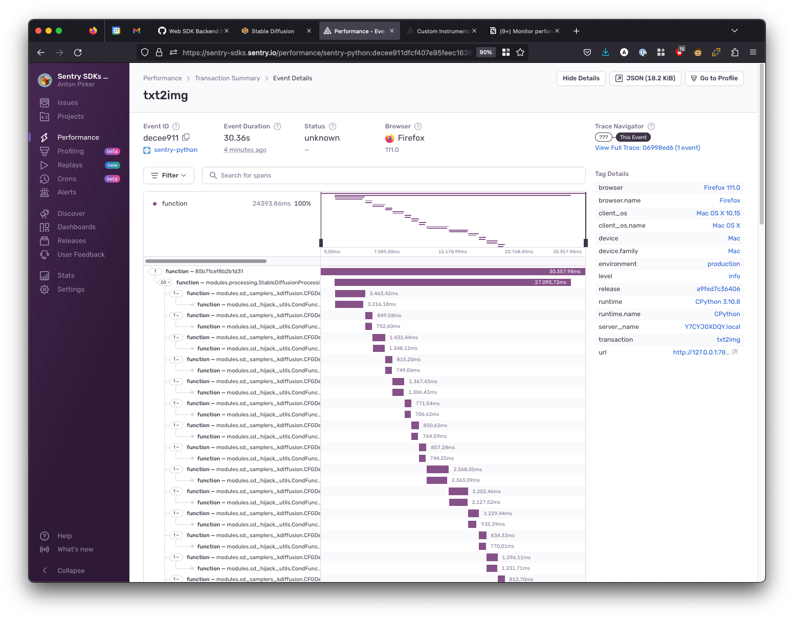 I created a new project on Sentry.io. Then I added the Sentry SDK to the Stable Diffusion web UI and enabled traces and profiles. I put this into txt2img.py because I guessed that was the entry point of the image generation from text prompts: