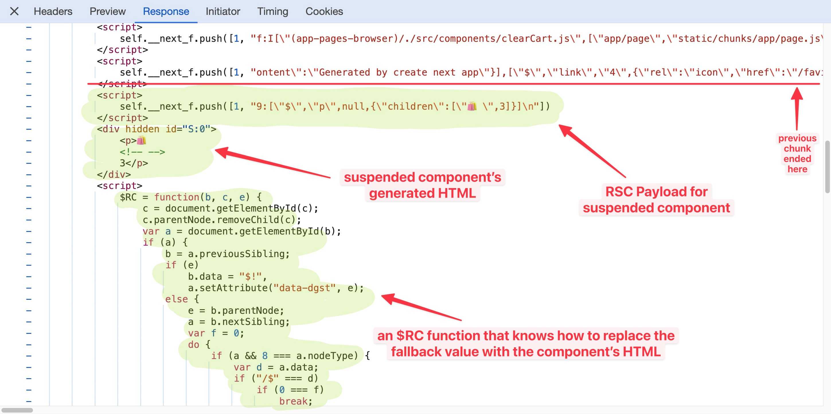 I know that’s a lot of plates spinning and pieces moving around at various times. What it boils down to, however, is that a page visit triggers Next.js to render as much HTML as it can, using the fallback values for any suspended components, and then sends that to the browser. Meanwhile, Next.js triggers the suspended async components and gets them formatted in HTML and contained in RSC Payloads that are streamed to the browser, one by one, along with an $RC script that knows how to swap things out.