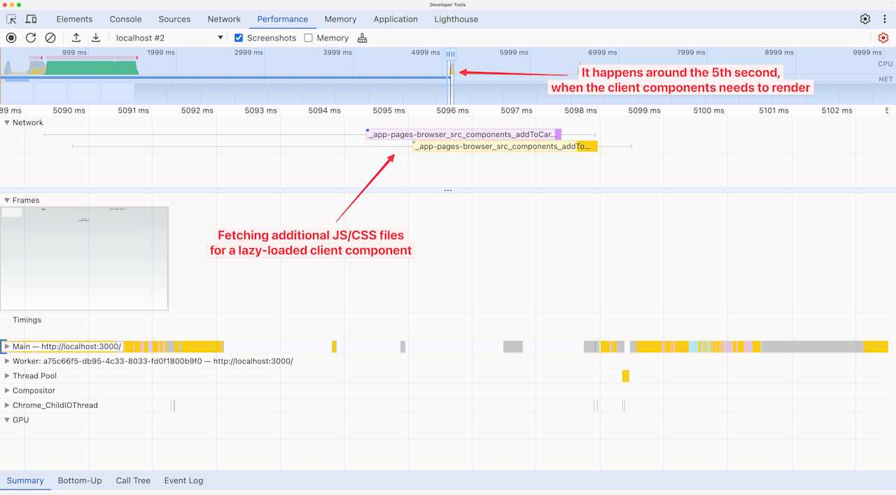 We can also see that a lazy-loaded Client Component is discovered at the same time, and it contains CSS and JavaScript files that need to be fetched. These files weren’t part of the initial bundle because the component isn’t needed until later on; the code is split into their own files.