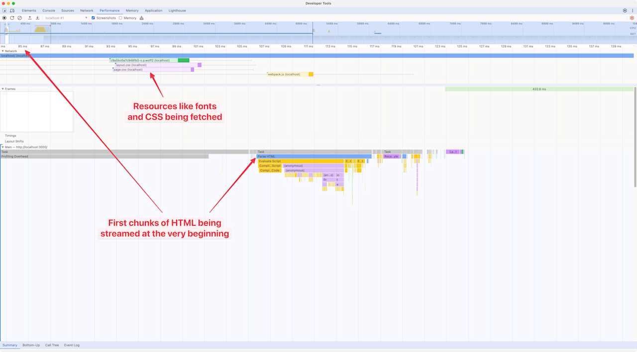 The image above shows the DOMContentLoaded event is reported at the end of the page load timeline. And, just before that, we can see that the localhost HTTP request comes to an end. That means the server has likely sent the last zero-sized chunk, indicating to the client that the data is fully transferred and that the streaming communication can be closed.