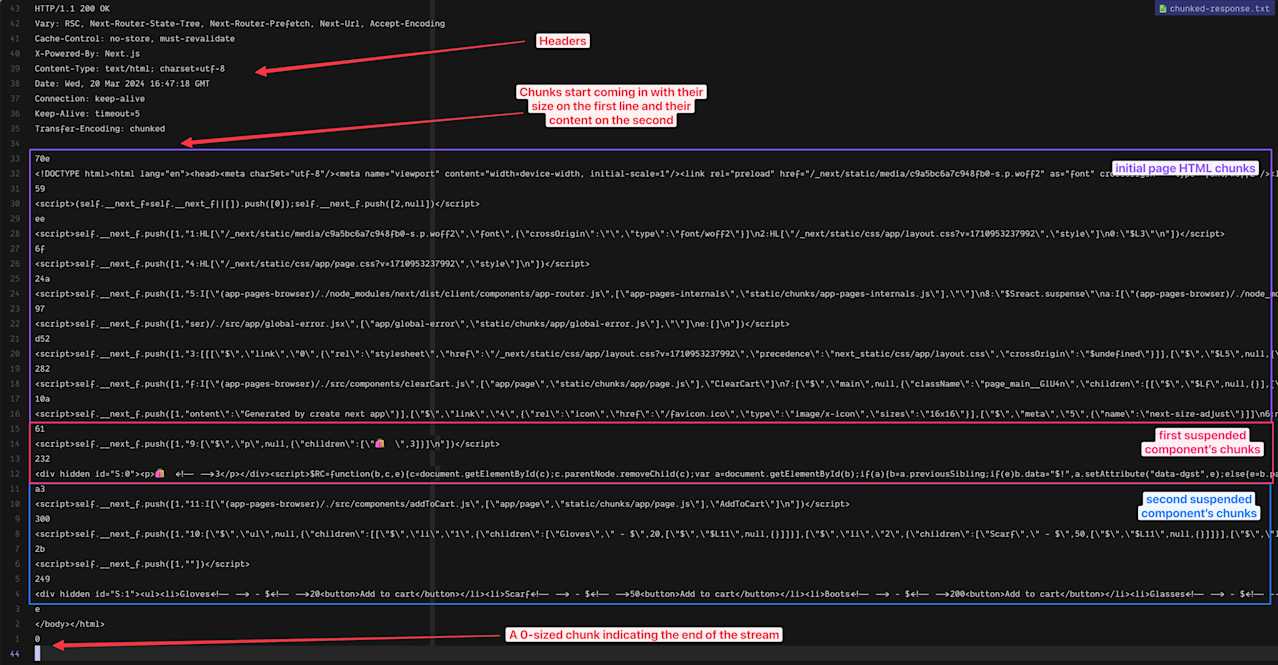 The first chunk starts with the <!DOCTYPE html> declaration. The second-to-last chunk, meanwhile, contains the closing </body> and </html> tags. So, we can see that the server streams the entire document from top to bottom, then pauses to wait for the suspended components, and finally, at the end, closes the body and HTML before it stops streaming.