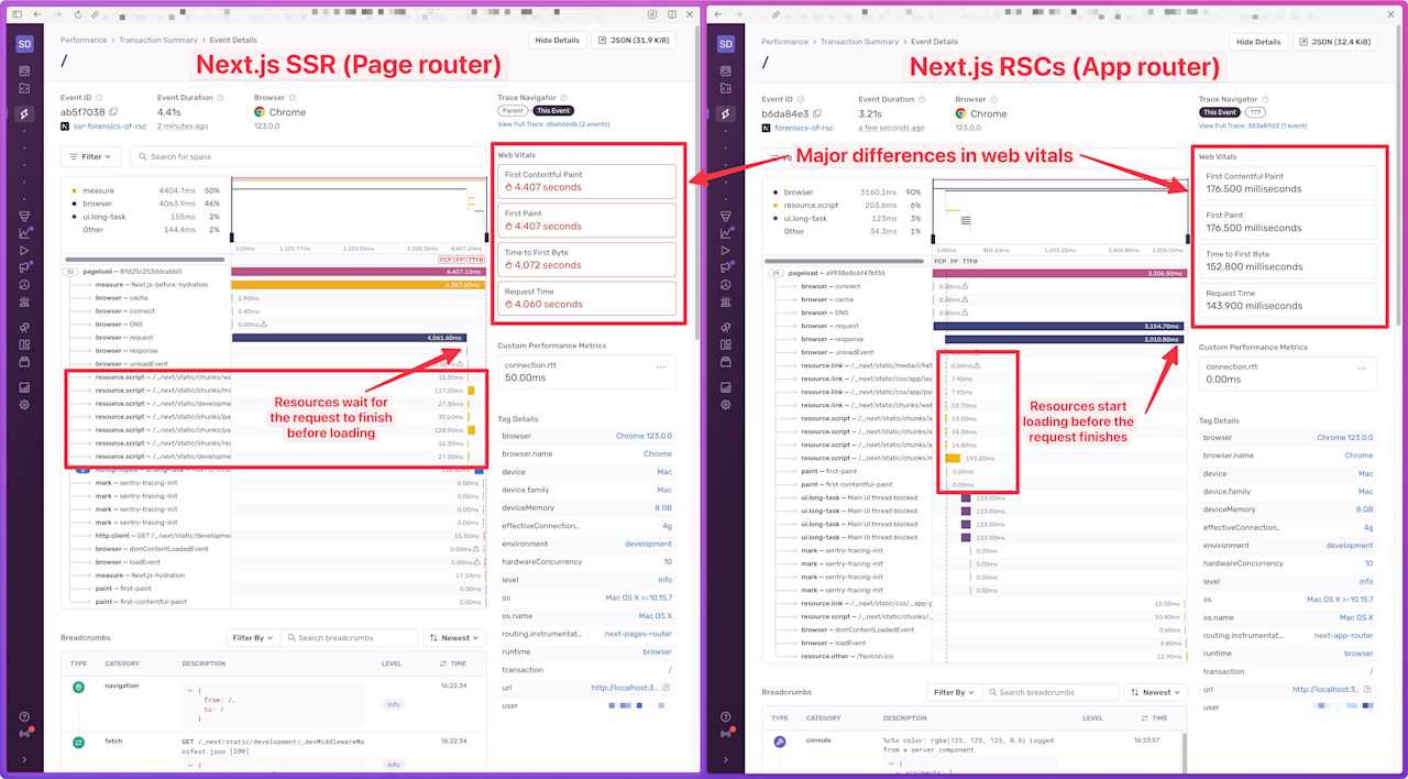 Looking at these two reports I pulled from Sentry, we can see that streaming allows the page to start loading its resources before the actual request finishes. This significantly improves the Web Vitals metrics, which we see when comparing the two reports.