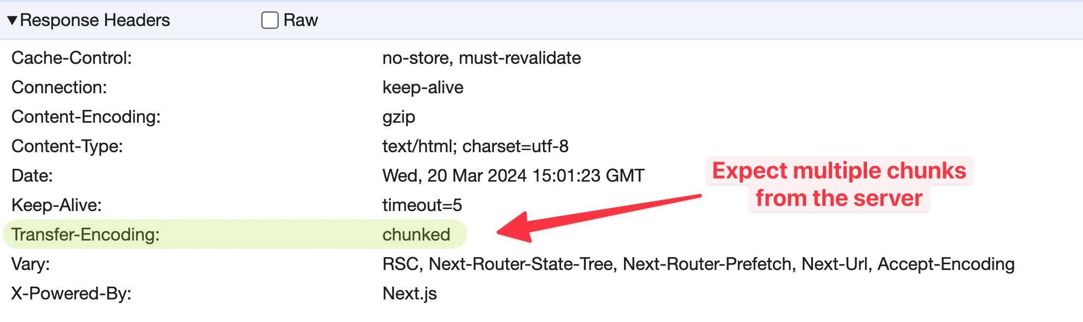 The server returns a Transfer-Encoding: chunked header that lets the browser know to expect streaming HTML. This prepares the browser for receiving multiple chunks of the document, rendering them as it receives them. We can actually see the header when opening Developer Tools at the Network tab. Trigger a refresh and click on the document request.