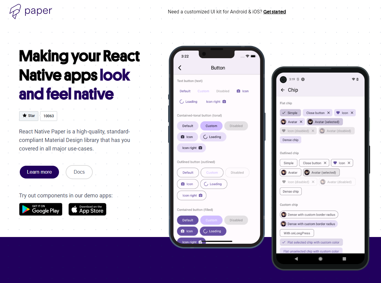 React Native Paper is another free and open-source component library. It follows Google's Material Design guidelines and provides a set of excellent production-ready components covering any use case. Furthermore, you can use React Native to maintain a consistent design across the web and mobile applications since it supports web, iOS, and Android.