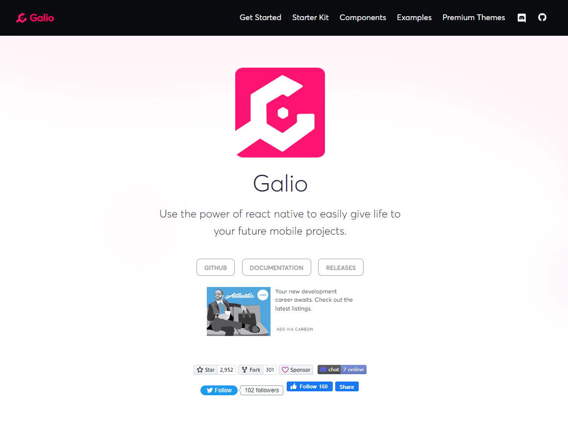 Galio is an open-source React Native component library designed with care by developers for developers. It provides ready-made elements and beautiful foundation themes with multiple customization options for your project.