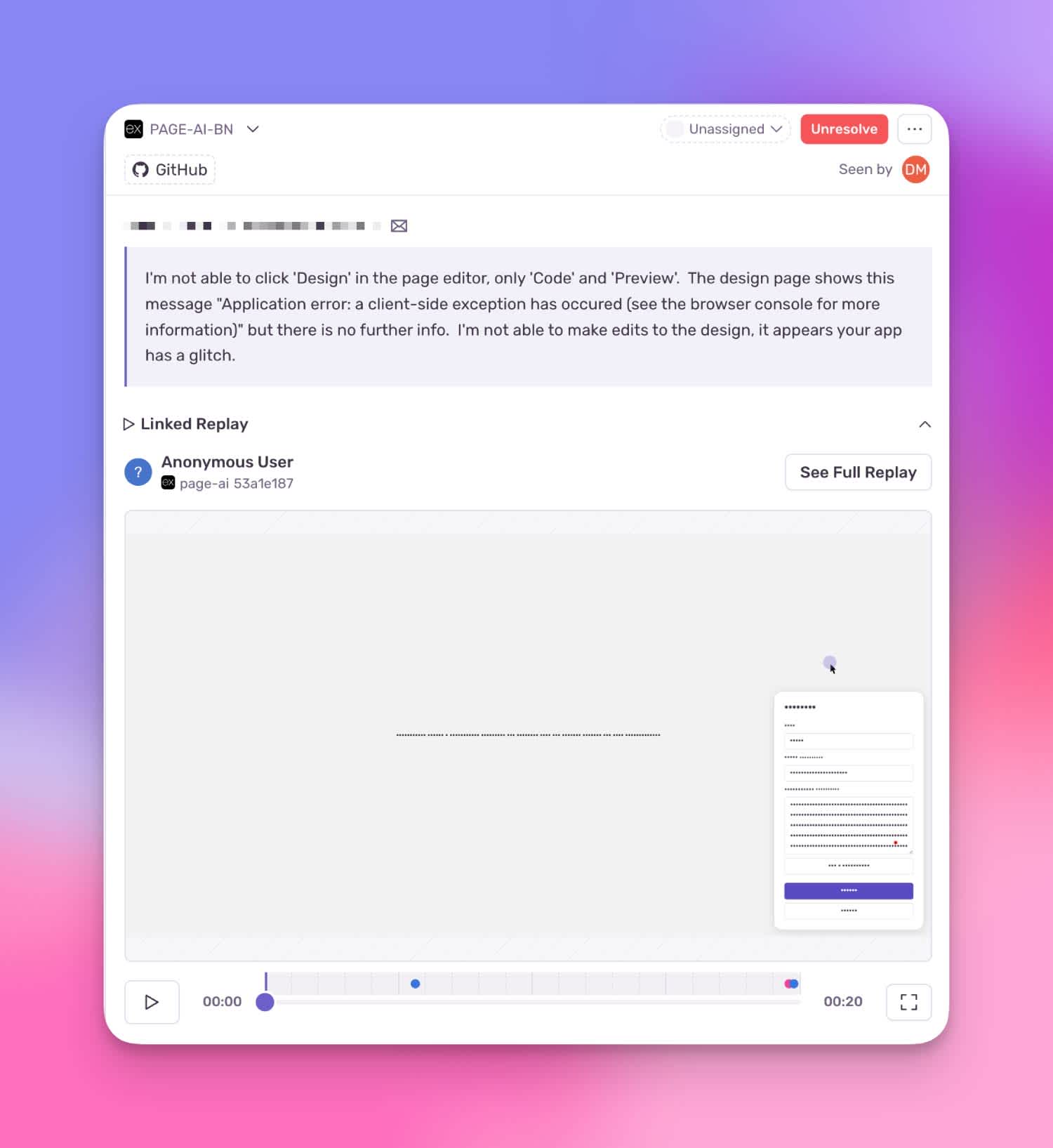 User sending feedback with an error