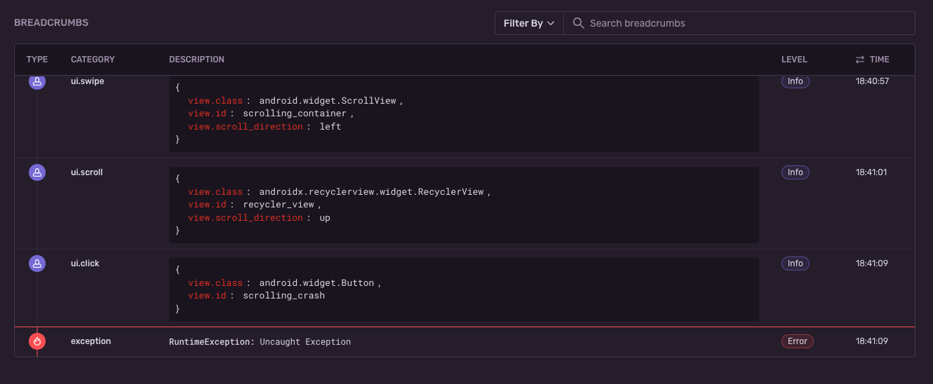 When we record breadcrumbs, we capture some useful metadata of the target view; information like view id, view class, and scroll direction (in case the view is scrollable). This can help tremendously in understanding the root cause of an issue because you can analyze and even reproduce user actions prior to the crash event.