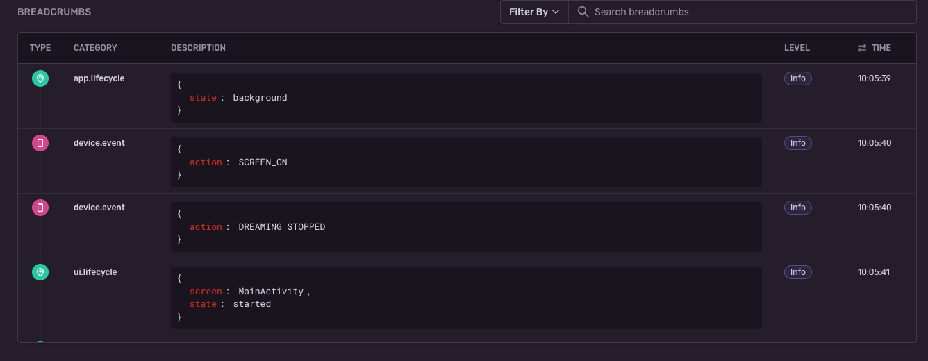 Now, when your application crashes — in addition to already existing breadcrumbs — you also will see the trace of UI events that happened prior to the crash event.It’ll look similar to this:
