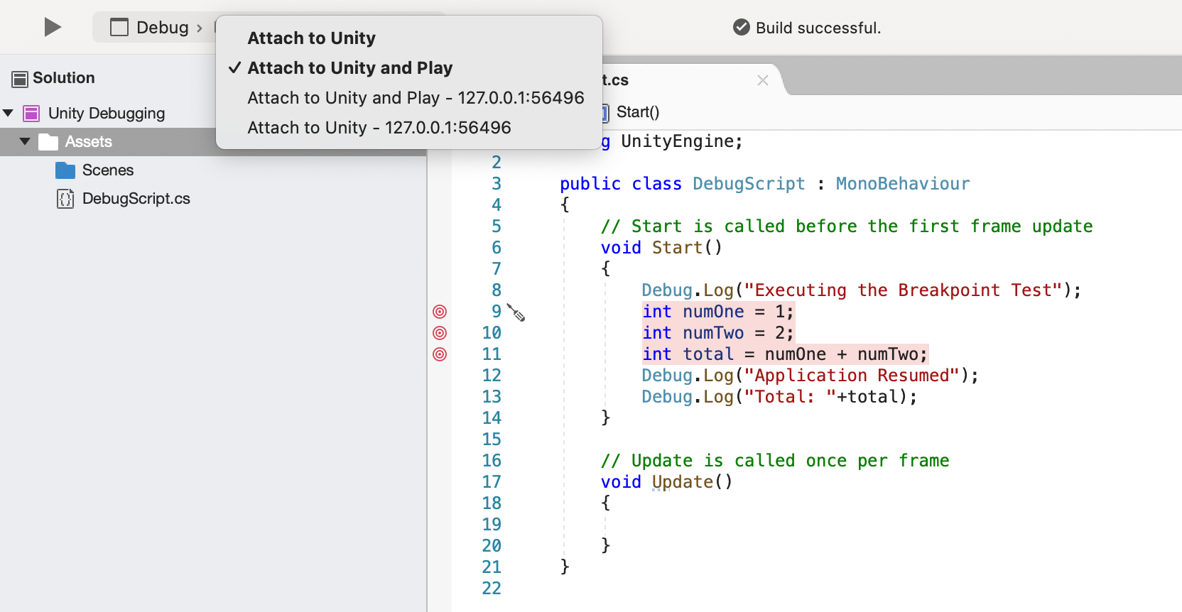 To create breakpoints in Unity, navigate to the script in Visual Studio and place breakpoints the way you'd normally on a code line.