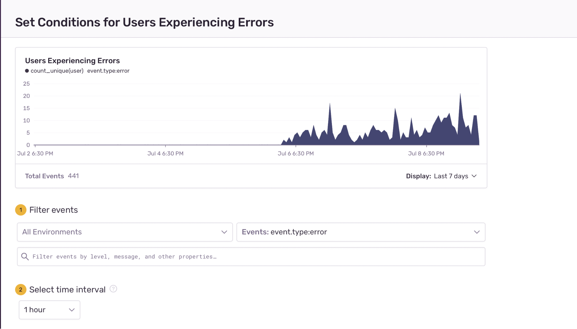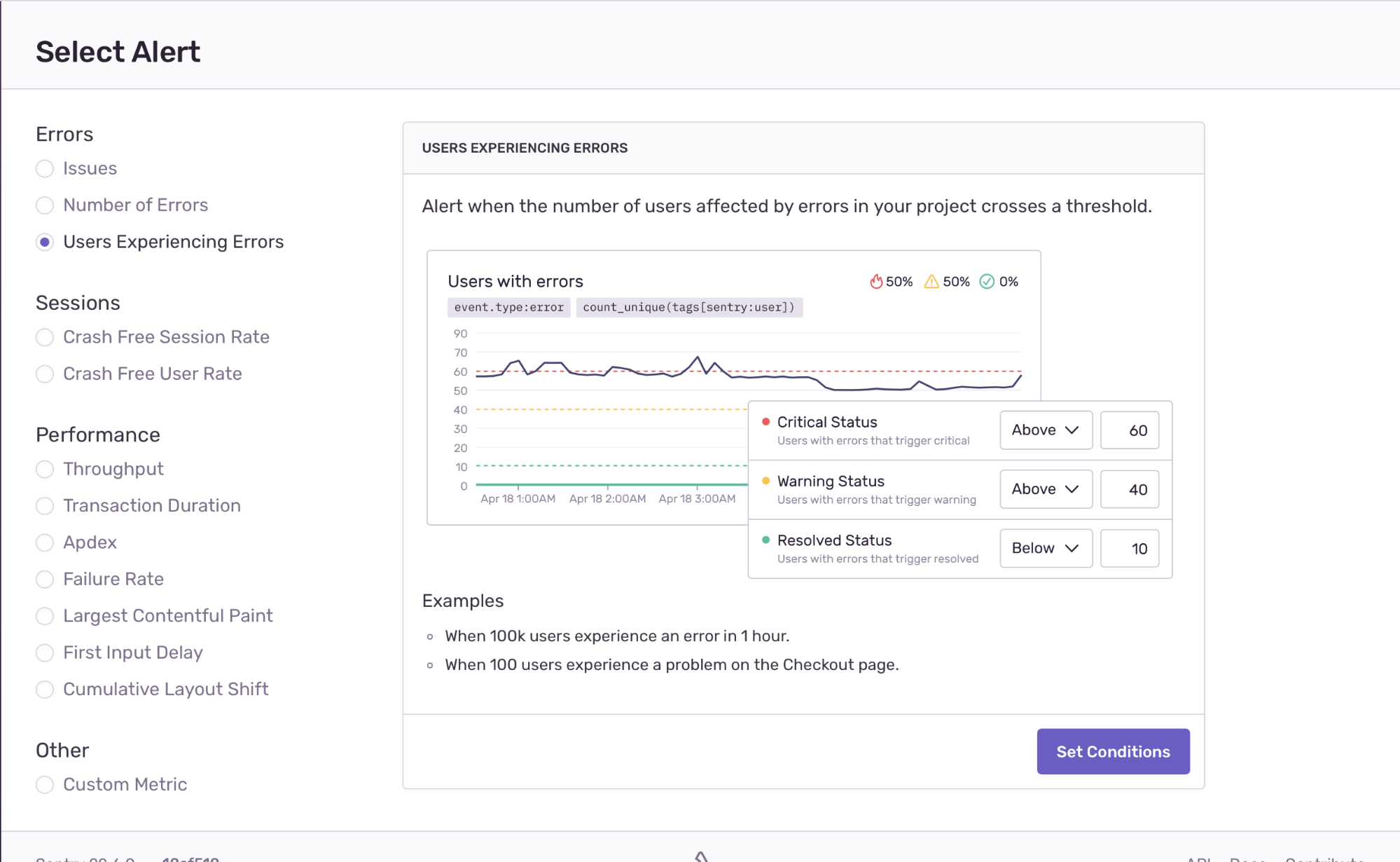 Afterward, provide the error type. You can proceed with "Issues," "Number of Error," or "Users Experiencing Errors" based on the requirement. After specifying the error, click "Set Conditions."