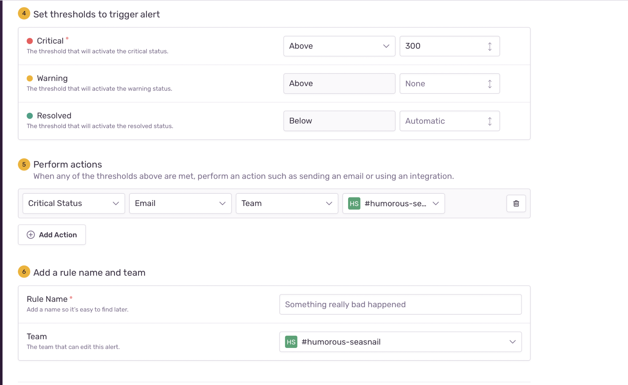 "Perform Actions" allows developers to configure the callback for the alert. For example, you can choose to send an email depending on the trigger stats (Critical, Warning, Resolved).