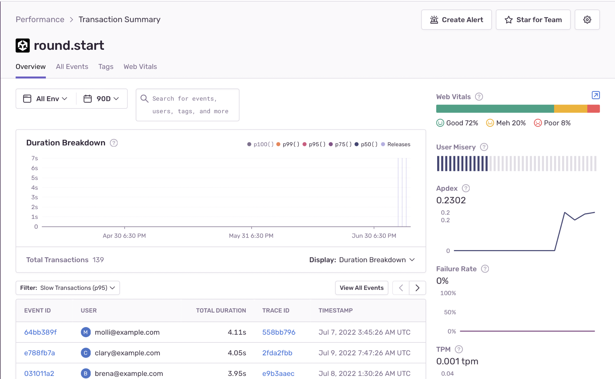 Sentry is a platform that allows users to trace Unity applications and enhance monitoring and debugging capabilities. In addition, Sentry provides performance monitoring that automatically tracks the game's performance. Apart from that, it supports automatic error capturing. It ensures that users can have a single dashboard to enforce their games' observability effectively.